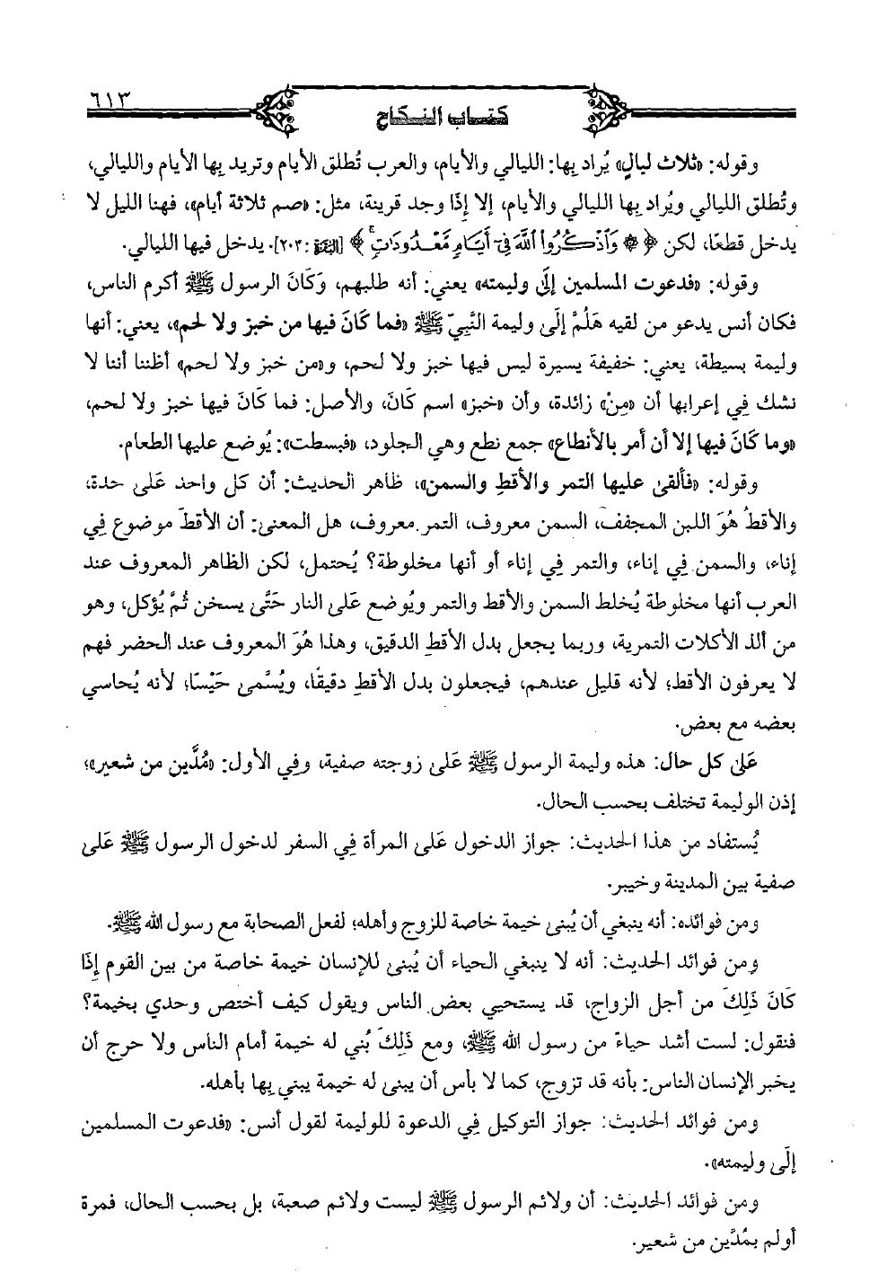 وقوله: «فدعوت المسلمين إلى وليمته» يعني: أنه طلبهم, وكان الرسول صلى الله عليه وسلم أكرم الناس, فكان أنس يدعو من لقيه هلم إلى وليمة النبي صلى الله عليه وسلم «فما كان فيها من خبز ولا حلم» , يعني أنها وليمة بسيطة, يعني: خفيفة يسيرة ليس فيها خبز ولا لحم, «ومن خبز ولا لحم» أظننا أننا لا نشط في إعرابها أن "مِن" زائدة, وأن «خبز» اسم كان, والأصل: فما كان فيها خبز ولا لحم, «وما كان فيها إلا أن أمر بالأنطاع» جمع نطع وهي الجلود, "فبسطت": يوضع عليها الطعام.