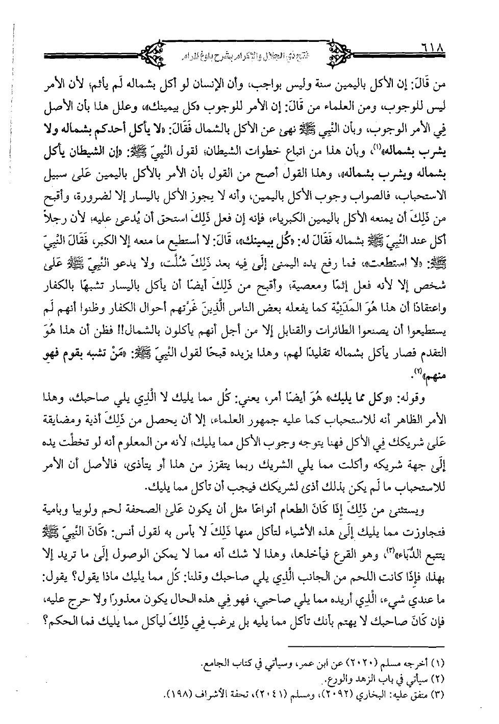 من قال: أن الأكل باليمين سنة وليس بواجب, وأن الإنسان لو أكل بشماله لم يأثم, لأن الأمر ليس للوجوب, ومن العلماء من قال: إن الأمر للوجوب «كل بيمينك» وعلل هذا بأن الأصل في الأمر الوجوب, وبأن النبي صلى الله عليه وسلم نهى عن الأكل بالشمال فقال: «لا يأكل أحدكم بشماله ولا يشرب بشماله» , وبأن هذا من إتباع خطوات الشيطان, لقول النبي صلى الله عليه وسلم: «إن الشيطان يأكل بشماله ويشرب بشماله» , وهذا القول أصح من القول بأن الأمر بالأكل باليمين على سبيل الاستحباب, فالصواب وجوب الأكل باليمين, وأنه لا يجوز الأكل باليسار إلا لضرورة, وأقبح من ذلك أن يمنعه الأكل باليمين الكبرياء, فإنه إن فعل ذلك استحق أن يدعى عليه, لأن رجلاً أكل عند النبي صلى الله عليه وسلم بشماله فقال له: «كل بيمينك» , قال: لا استطيع ما منعه إلا الكبر, فقال النبي صلى الله عليه وسلم: «لا استطعت» فما رفع يده اليمنى إلى فيه بعد ذلك شُلت, ولا يدعو النبي على شخص إلا لأنه فعل إثماً ومعصية, وأقبح من ذلك أيضًا أن يأكل باليسار تشبهاً بالكفار واعتقاداً أن هذا هو المدينة منا يفعله بعض الناس الذين غرتهم أحوال الكفار وظنوا أنهم لم يستطيعوا أن يصنعوا الطائرات والقنابل إلا من أجل أنهم يأكلون بالشمال! ! فظن أن هذا هو التقدم فصار يأكل بشماله تقليداً لهم, وهذا يزيده قبحاً لقول النبي صلى الله عليه وسلم: «ومن تشبه بقوم فهو منهم».