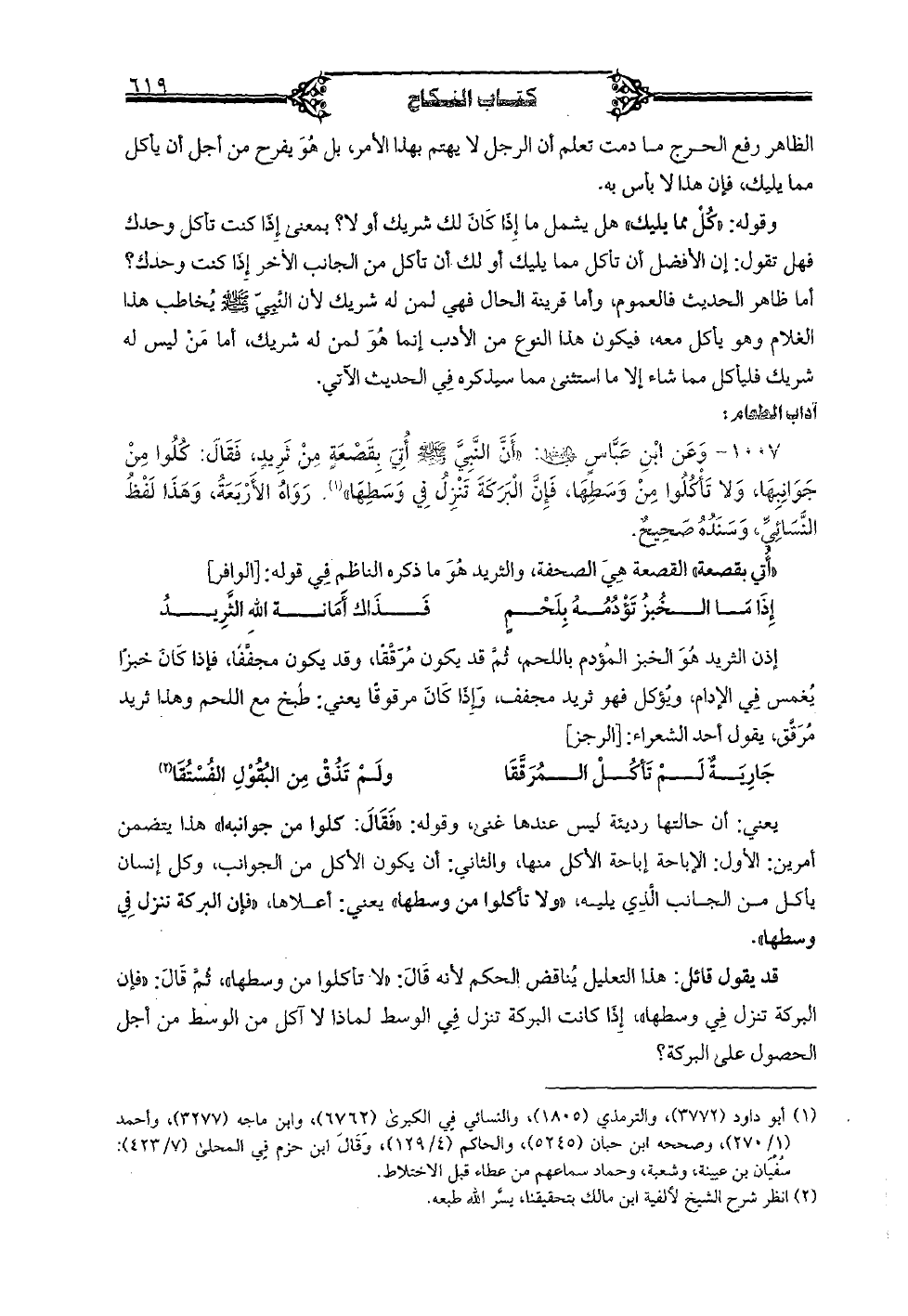 1007 - وعن ابن عباس رضي الله عنه: «أن النبي صلى الله عليه وسلم أتى بقصعةٍ من ثريدٍ, فقال: كلوا من جوانبها, ولا تأكلوا من وسطها, فإن البركة تنزل في وسطها». رواه الأربعة, وهذا لفظ النسائي, وسندهُ صحيحٌ.