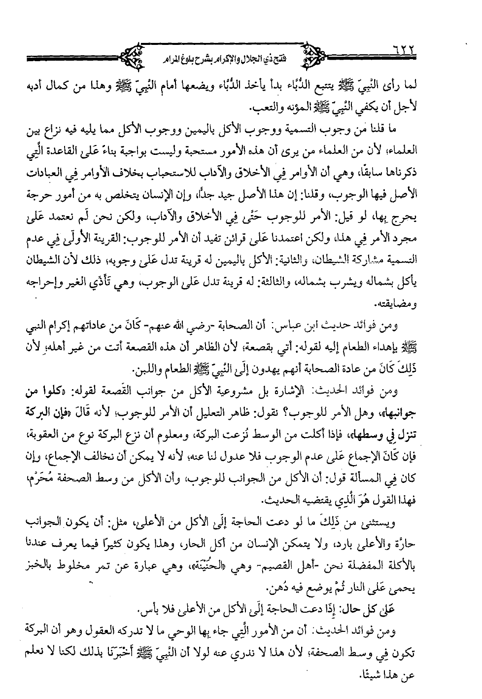 ومن فوائد الحديث: الإشارة بل مشروعية الأكل من جوانب القصعة لقوله: «كلوا من جوانبها» , وهل الأمر للوجوب؟ نقول: ظاهر التعليل أن الأمر للوجوب, لأنه قال «فإن البركة تنزل في وسطها» , فإذا أكلت من الوسط نزعت البركة, ومعلوم أن نزع البركة نوع من العقوبة, فإن كان الإجماع على عدم الوجوب فلا عدول لنا عنه, لأنه لا يمكن أن نخالف الإجماع, وإن كان في المسألة قول: أن الأكل من الجوانب للوجوب, وأن الأكل من وسط الصحفة محرم, فهذا القول هو الذي يقتضيه الحديث.