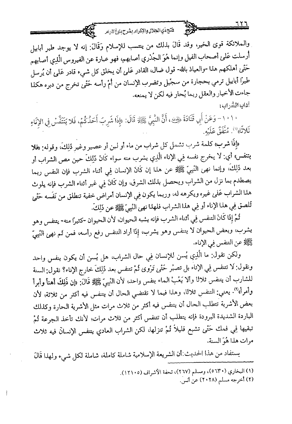 ولكن نقول: ما الذي يسن للإنسان في حال الشراب, هل يسن أن يكون بنفس واحد ونقول: لا تتنفس في الإناء بل تصبر حتى تروى ثم تتنفس بعد ذلك خارج الإناء؟ نقول: السنة للشارب أن يتنفس ثلاثاً وألا يعب الماء بنفس واحد, لأن النبي صلى الله عليه وسلم قال: «إن ذلك أهنأ وأبرأ وأمرأ». يعني: التنفس ثلاثاً, وهذا فيما لا تقتضي الحال أن يتنفس فيه أكثر من ثلاثة, لأن بعض الأشربة تتطلب الحال أن يتنفس فيه أكثر من ثلاث مرات مثل الأشربة الحارة وكذلك الباردة الشديدة البرودة فإنه يتطلب أن تتنفس أكثر من ثلاث مرات؛ لأنك تأخذ الجرعة ثم تبقيها في فمك حتى تشبع قليلاً ثم تنزلها, لكن الشراب العادي يتنفس الإنسان فيه ثلاث مرات هذا هو السنة.