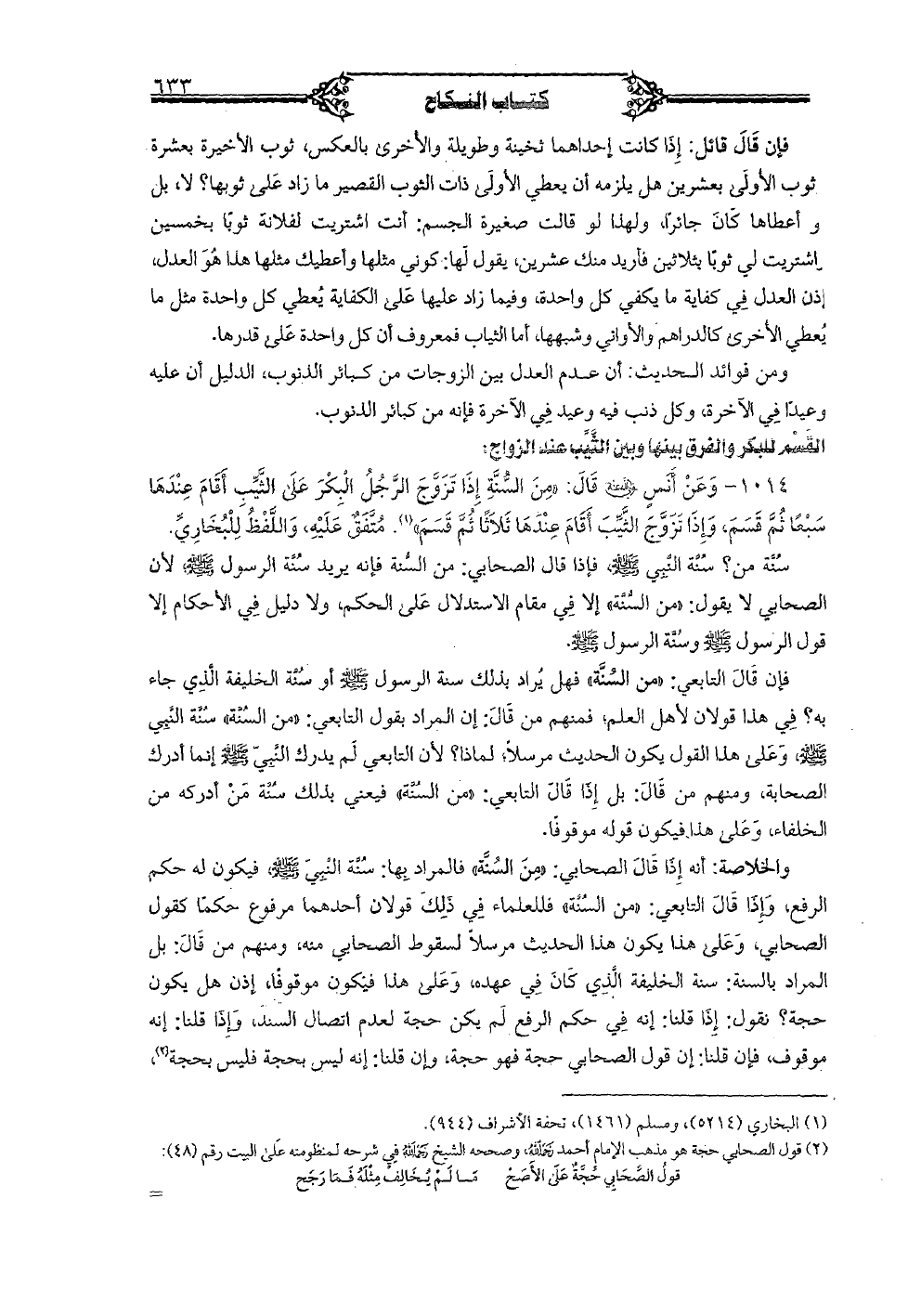 1014 - وعن أنس رضي الله عنه قال: "من السُّنَّة إذا تزوَّج الرَّجل البكر على الثَّيِّب أقام عندها سبعًا ثمَّ قسم، وإذا تزوَّج الثَّيِّب أقام عندها ثلاثًا ثمَّ قسم". متَّفق عليه، واللَّفظ للبخاريِّ.