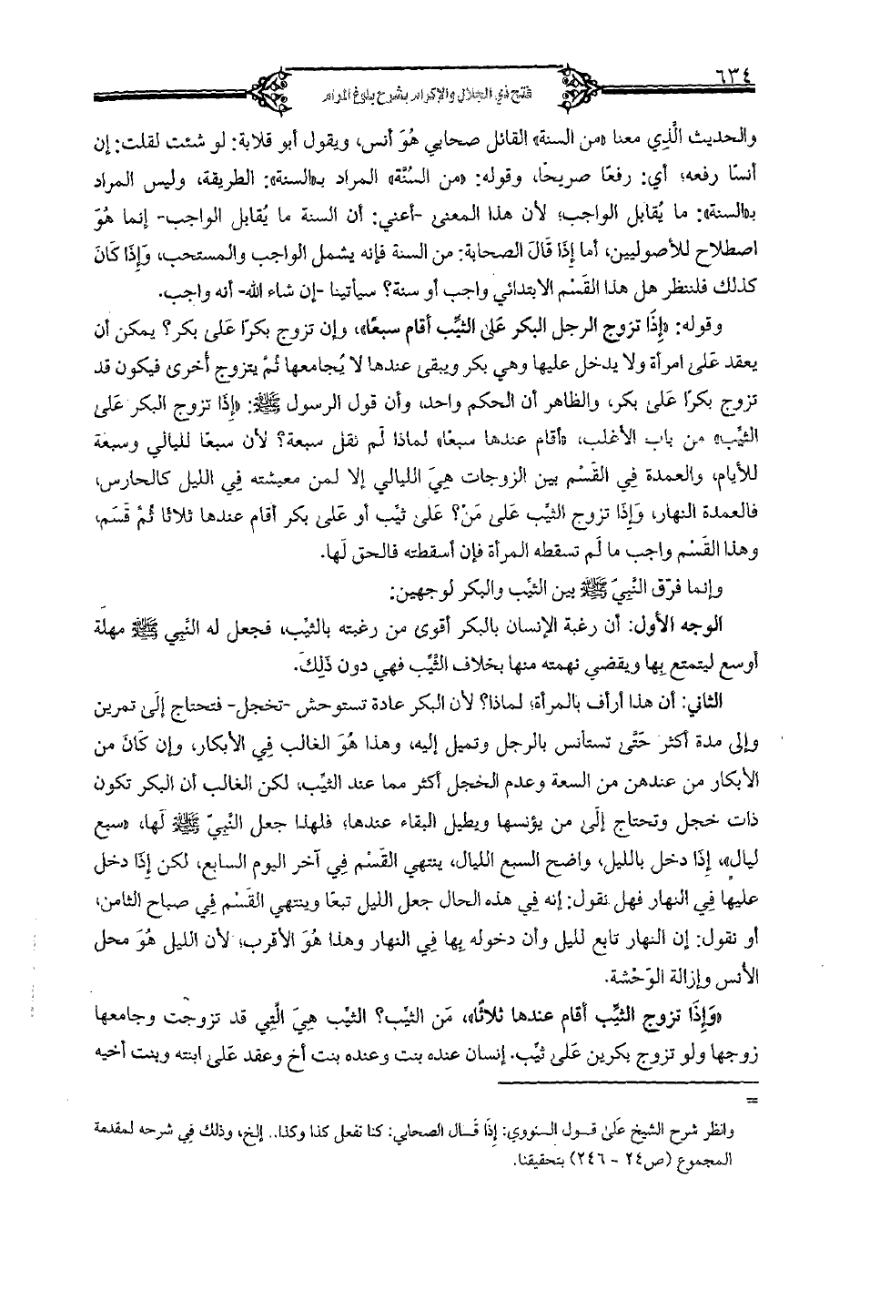 وقوله: "إذا تزوج الرجل البكر على الثيِّب أقام سبعًا"، وإن تزوج بكرًا على بكر؟ يمكن أن يعقد على امرأة ولا يدخل عليها وهي بكر ويبقي عندها لا يجامعها ثم يتزوج أخري فيكون قد تزوج بكرًا على بكر، والظاهر أن الحكم واحد، وأن قول الرسول ضلي الله عليه وسلم: "إذا تزوج البكر على الثَّيب"، من باب الأغلب، "أقام عندها سبعًا" لماذا لم نقل سبعة؟ لأن سبعًا لليالي وسبعة للأيام، والعمدة في القسم بين الزوجات هي الليالي إلا لمن معيشته في الليل كالحارس، فالعمدة النهار، وإذا تزوج الثيب على من؟ على ثيب أو على بكر أقام عندها ثلاثًا ثم قسم، وهذا القسم واجب ما لم تسقطه المرأة فإن أسقطته فالحق لها.