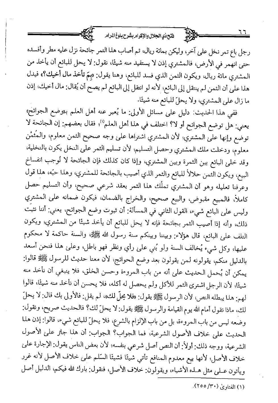 ففي هذا الحديث: دليل على مسائل الأولى: ما يعبر عنه أهل العلم بـ"وضع الجوائح" يعني: هل توضع الجوائح أو لا؟ اختلف في هذا أهل العلم، فقال بعضهم: إن الجائحة لا توضع وإنها على المشتري؛ لأن المشتري اشتراها على وجه صحيح الثمن معلوم، والمثمن معلوم، ودخلت ملك المشتري وحصل التسليم؛ لأن تسليم الثمر على النخل يكون بالنخلية، وقد خلى البائع بين الثمرة وبين المشتري، وإذا كان كذلك فإن الجائحة لا توجب انفساخ البيع، ويكون الثمن حلالا للبائع والثمر الذي أصيب بالجائحة للمشتري، وهذا حبه، هذا قول وعرفنا تعليله وهو أن المشتري تملك هذا الثمر بعقد شرعي صحيح، وأن التسليم حصل كاملاً، فالمبيع مقبوض، والبيع صحيح، والخراج بالضمان، فيكون ضمانه على المشتري وليس على البائع شيء في المسألة: أن ثبوت وضع الجوائح، يعني: أننا نثبت ذلك، وأنه إذا أصيب الثمر بجائحة فإنه لا يحل للبائع أن يأخذ شيئاً من المشتري، ويكون التلف على البائع، قال هؤلاء: وبيننا وبينكم سنة رسول الله صلى الله عليه وسلم والسنة حاكمة لا محكوم عليها، وكل شيء يخالف السنة ولو بني على رأي ونظر فهو باطل، وعلى هذا فنحن أسعد بالدليل منكم، يقولونه لمن يقولون بعد وضع الحوائج؛ لأن معنا حديث للرسول صلى الله عليه وسلم قالوا: يمكن أن يحمل الحديث على أنه من باب المروءة وحسن الخلٌ، فلا ينبغي أن نأخذ منه شيئا؛ لأن الرجل اشترى الثمر للأكل ولم يحصل له أكله، فلا يحسن أن نأخذ منه شيئا، قالوا لهم: هذا يبطله النص؛ لأن الرسول صلى الله عليه وسلم يقول: «فلا يحل لك؟ فالحديث صريح، ونقول: وضعه ليس من باب المروءة، بل من باب الإلزام بالشرع، فلا يحل للبائع شيء، قالوا: إذن هذا الحديث على خلاف الأصول الشرعية، فما الجواب؟ الجواب: أن هذا جاز على الأصول الشرعية، ووجه ذلك: أولا: أن النص أصل شرعي بنفسه؛ لأن بعض الناس يقول: الإجارة على خلاف الأصل؛ لأنها بيع معدوم المنافع تأتي شيئا فشيئا السلم على خلاف الأصل لأنه غرر ويأتون على مثل هذه الأشياء، ويقولون: خلاف الأصل، فنقول: بارك الله فيكم، الدليل أصل