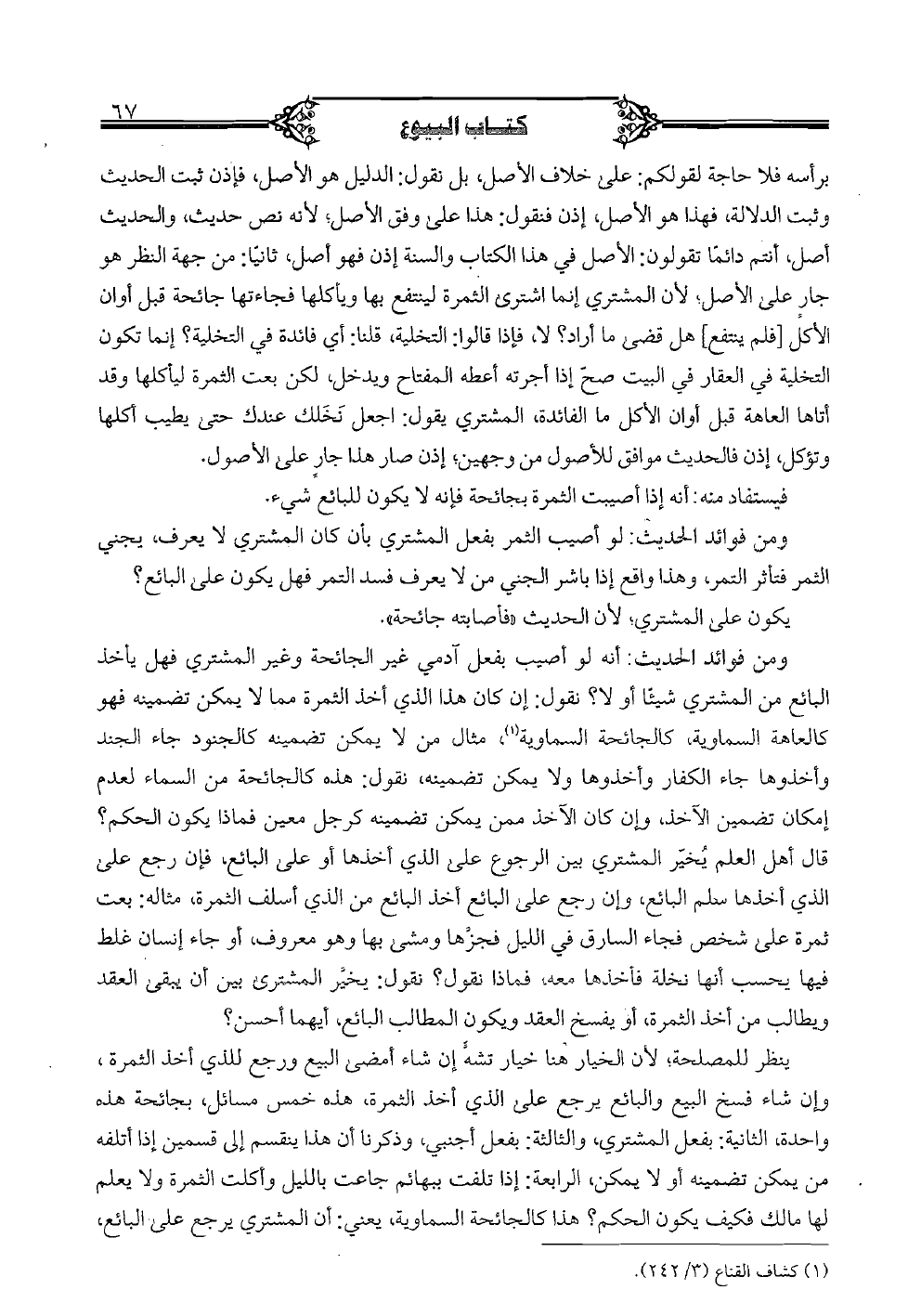 برأسه فلا حاجة لقولكم: على خلاف الأصل، بل نقول: الدليل هو الأصل، فإذا ثبت الحديث وثبت الدلالة، فهذا هو الأصل، إذن فنقول: هذا على وفق الأصل؛ لأنه نص حديث، والحديث أصل، أنتم دائنا تقولون: الأصل في هذا الكتاب والسنة إذن فهو أصل، ثانيا: من جهة النظر هو جار على الأصل؛ لأن المشتري إنما اشترى الثمرة لينتفع بها ويأكلها فجاءتها جائحة قبل أوان الأكل [فلم ينتفع] هل قضى ما أراد؟ لا، فإذا قالوا: التخلية، قلنا: أي فائدة في التخلية؟ إنما تكون التخلية في العقار في البيت صح إذا أجرته أعطه المفتاح ويدخل، لكن بعت الثمرة ليأكلها وقد أتاها العاهة قبل أوان الأكل ما الفائدة، المشتري يقول: اجعل نخلك عندك حتى يطيب أكلها وتؤكل، إذن فالحديث موافق للأصول من وجهين؛ إذا صار هذا جار على الأصول.