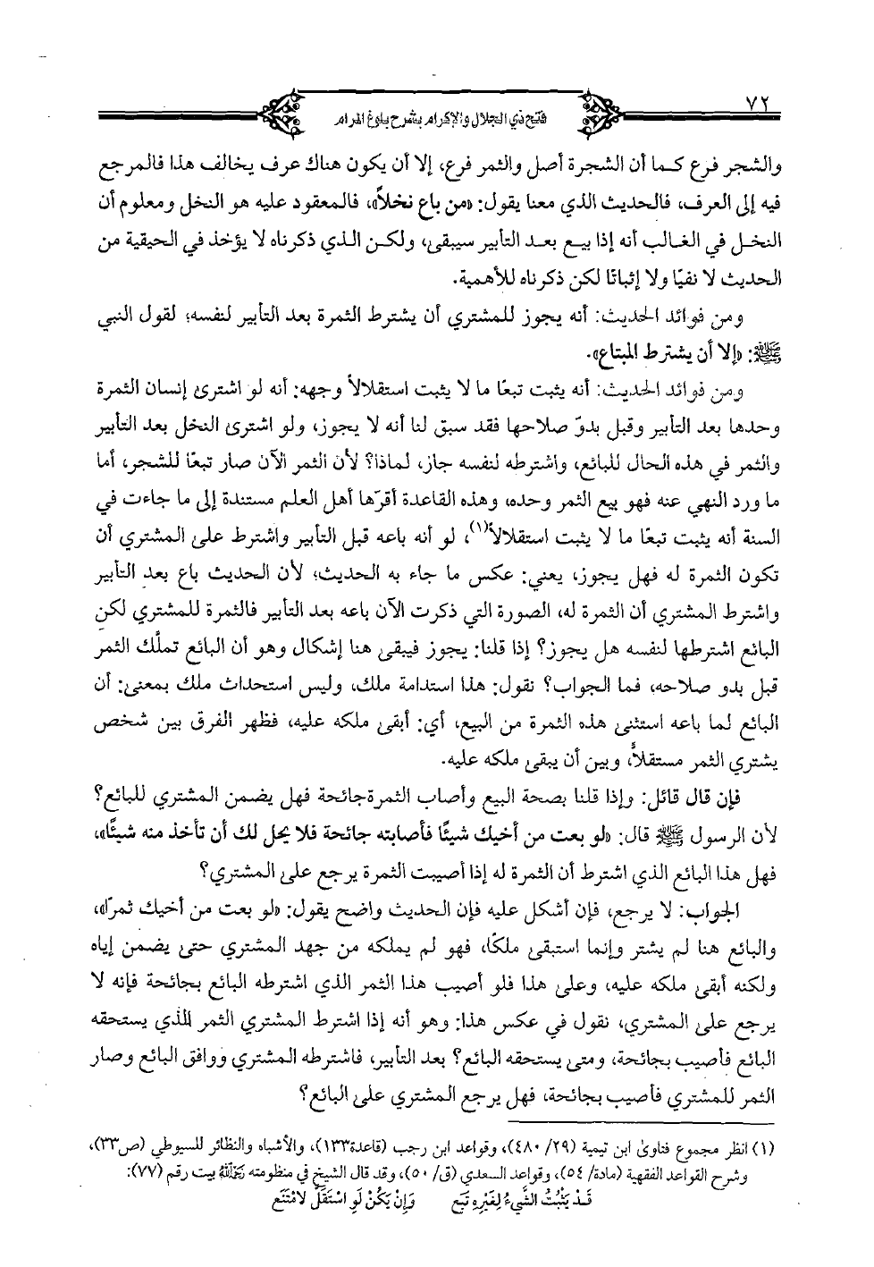 الجواب: لا يرجع، فإن أشكل عليه فإن الحديث واضح يقول: «لو بعت من أخيك ثمرا»، والبائع هنا لم يشتر وإنما استبقى ملكا، فهو لم يملكه من جهد المشتري حتى يضمن إياه ولكنه أبقى ملكه عليه، وعلى هذا فلو أصيب هذا الثمر الذي اشترطه المشتري الثمر الذي يستحقه البائع فأصيب بجائحة، فهل يرجع المشتري على البائع؟