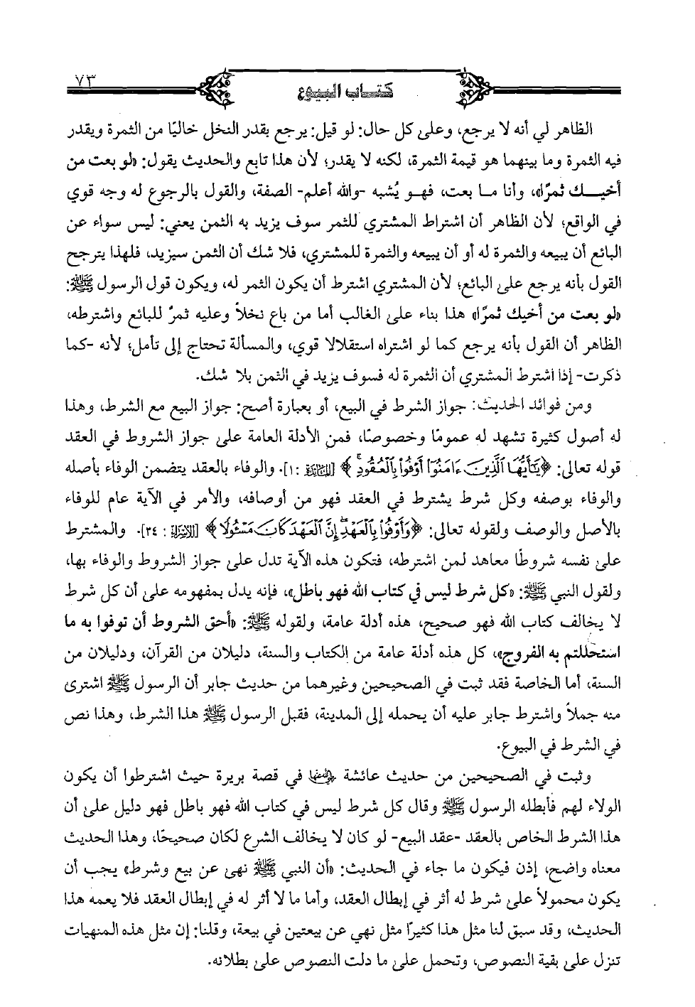 ومن فوائد الحديث: جواز الشرط في البيع، أو بعبارة أصح: جواز البيع مع الشرط، وهذا له أصول كثير تشهد له عموما وخصوصا، فمن الأدلة العامة على جواز الشروط في العقد قوله تعالى: {يا أيها الذين أمنوا أوفوا بالعقود} [المائدة: 1]. والوفاء بالعقد يتضمن الوفاء بأصله والوفاء بوصفه وكل شرط يشترط قي العقد فهو من أوصافه، والأمر في الآية عام للوفاء بالأصل والوصف ولقوله تعالى: {وأوفوا بالعهد إن العهد كان مسئولا} [الإسراء: 34]. والمشترط على نفسه شروطا معاهد لمن اشترطه، فتكون هذه الآية تدل على جواز الشروط والوفاء بها، ولقول النبي صلى الله عليه وسلم: «أحق الشروط أن توفوا به ما استحللتم به الفروج» كل هذه أدلة عامة من الكتاب والسنة، دليلان من القرآن، ودليلان من السنة، أما الخاصة فقد ثبت في الصحيحين وغيرها من حديث جابر أن الرسول صلى الله عليه وسلم اشترى منه جملا واشترط جابر عليه أن يحمله إلى المدينة، فقبل الرسول صلى الله عليه وسلم هذا الشرط، وهذا نص في الشرط في البيوع.