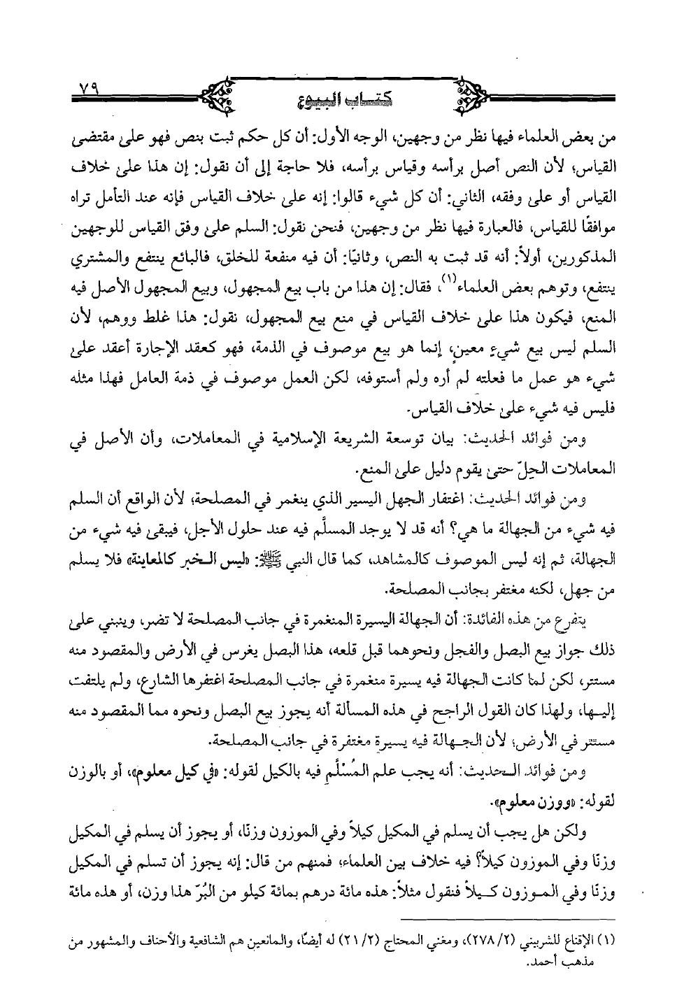 من بعض العلماء فيها نظر من وجهين، الوجه الأول: أن كل حكم ثبت بنص فهو على مقتضى القياس؛ لأن النص أصل برأسه وقياس برأسه، فلا حاجة إلى أن نقول: إن هذا على خلاف القياس أو على وفقه، الثاني: أن كل شيء قالوا: إنه على خلاف القياس فإنه عند التأمل تراه موافقا للقياس، فالعبارة فيها نظر من وجهين، فنحن نقول: السلم على وفق القياس للوجهين المذكورين، أولاً: أنه قد ثبت به النص، وثانيا: أن فيه منفعة للخلق، فالبائع ينتفع والمشتري ينتفع، وتوهم بعض العلماء، فقال: إن هذا من باب بيع المجهول، وبيع المجهول الأصل فيه المنع، فيكون هذا على خلاف القياس في منع بيع المجهول، نقول: هذا غلط ووهم، لأن السلم ليس بيع شيء معين، إنما هو بيع موصوف في الذمة، فهو كعقد الإجازة أعقد على شيء هو عمل ما فعلته لم أره ولم أستوفه، لكن العمل موصوف في ذمة العامل فهذا مثله فليس فيه شيء على خلاف القياس.