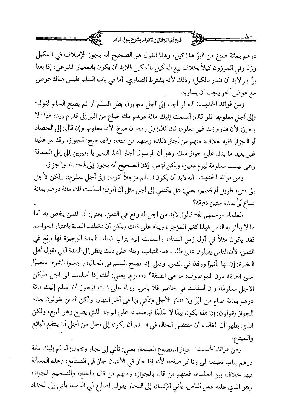 ومن فوائد الحديث: أنه لو أجله إلى أجل مجهول بطل السلم أو لم يصح السلم لقوله: "إلى أجل معلوم"، فلو قال: أسلمت إليك مائة درهم مائة صاع من البر إلى قدوم زيد، فهذا لا يجوز؛ لأن قدوم زيد غير معلوم، فإن قال: إلى رمضان صح؛ لأنه معلوم، وإن قال: إلى الحصاد أو الجزاز ففيه خلاف، منهم من أجاز ذلك، ومنهم من منعه، والصحيح: الجواز، وقد مر علينا غير بعيد ما يدل على جواز ذلك وهو أن الرسول أجاز أخذ البعير بالبعيرين إلى إبل الصدقة وهي ليست معلومة ليست معلومة ليوم معين، ولكن لزمن، إذا لصحيح أنه يجوز إلى الحصاد والجزاز.