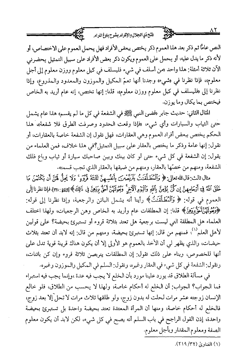 مثال ثالث: قال الله تعالى: {والمطلقات يتربصن بأنفسهن ثلاثة قروء ولا يحل لهن أن يكتمن ما خلق الله في أرحامهن إن كن يؤمن بالله واليوم الآخر وبعولتهن أحق بردهن في ذلك} [البقرة: 228]. فإذا نظرنا إلى العموم في قوله: {والمطلقات} رأينا أنه يشمل البائن والرجعية، وإذا نظرنا إلى قوله: {وبعولتهن أحق بردهن} قلنا: إن المطلقات عام وأريد به الخاص وهن الرجعيات، ولهذا اختلف العلماء هل المطلقة التي ليست برجعية هل تعتد بثلاثة قروء تستبرئ بحيضه؟ على قولين لأهل العلم؛ فمنهم من قال: إنها تستبرئ بحيضة، ومنهم من قال: إنه لابد أن تعتد بثلاث حيضات، والذي يظهر لي أن الأخذ بالعمود هو الأولى إلا أن يكون هناك قرينة قوية تدل على أنها للخصوص، وبناء على ذلك نقول: إن المطلقات يتربصن ثلاثة قروء وإن كان بائنات، ونقول: الشفعة في كل العقار وغيره، ونقول: السلم في المكيل والموزون وغيره.