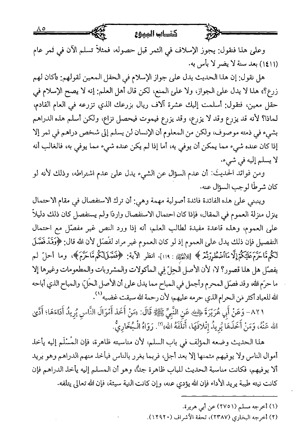 هل نقول: إن هذا الحديث يدل على جواز الإسلام في الحقل المعين لقولهم: "أكان لهم زرع؟ " هذا لا يدل على الجواز، ولا على المنع، لكن قال أهل العلم: إنه لا يصح الإسلام في حقل معين، فتقول: أسلمت إليك عشرة آلاف ريال بزرعك الذي تزرعه في العام القادم، لماذا؟ لأنه قد يزرع وقد لا يزرع، وقج يزرع فيموت فيحصل نزاع، ولكن أسلم هذه الدراهم بشيء في ذمته موصوف، ولكن من المعلوم أن الإنسان لن يسلم إلى شخص دراهم في ثمر إلا إذا كان عنده شيء مما يمكن أن يوفي به، أما إذا لم يكن عنده شيء مما يوفي به، فالغالب أنه لا يسلم إليه في شيء.