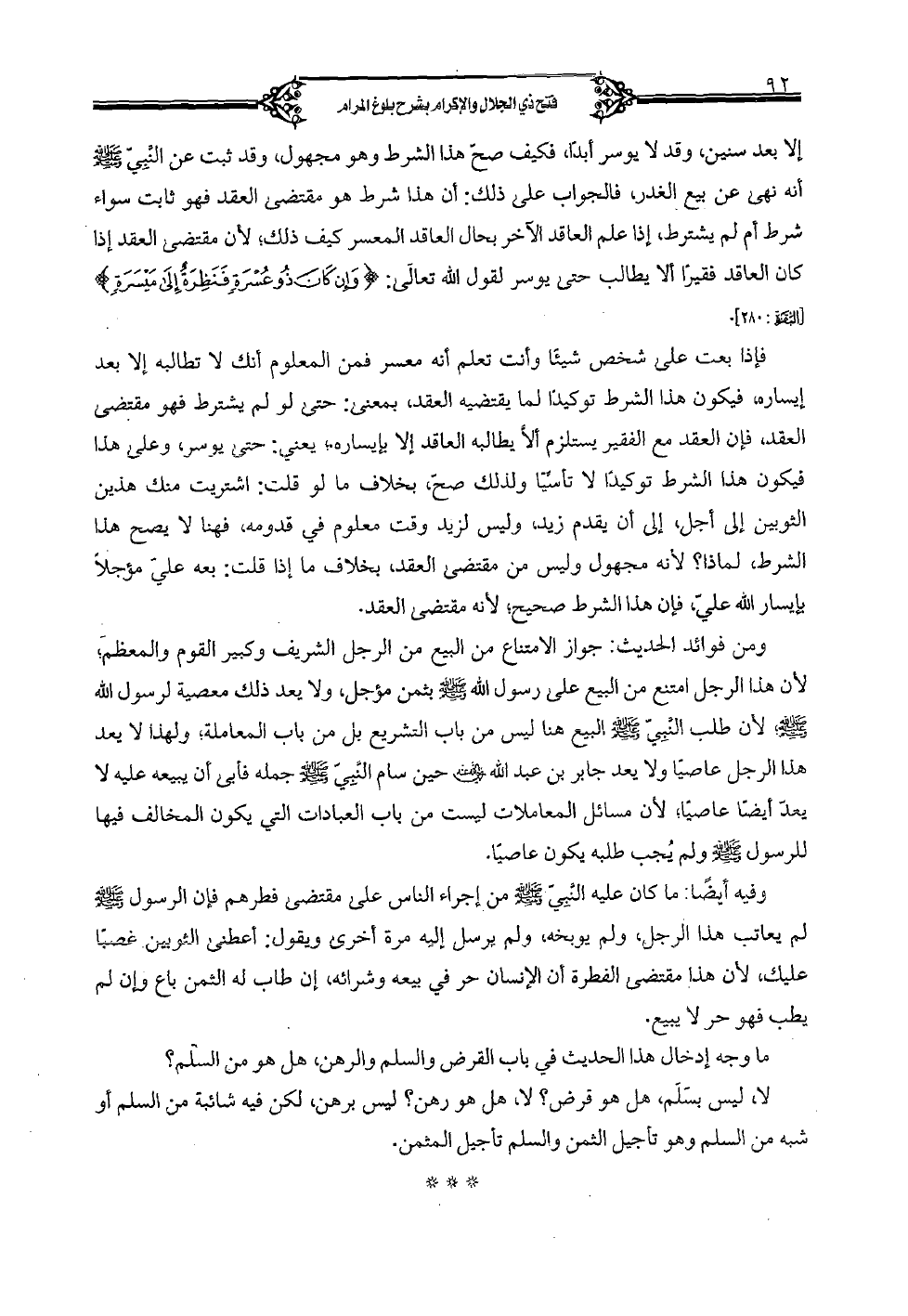 إلا بعد سنين، وقد لا يوسر أبدا، فكيف صح هذا الشرط وهو مجهول، وقد ثبت النبي صلى الله عليه وسلم أنه نهى عن بيع الغدر، فالجواب على ذلك: أن هذا شرط هو مقتضى العقد فهو ثابت سواء شرط أم لم يشرط، إذا علم العاقد الآخر بحال العاقد المعسر كيف ذلك؛ لأن مقتضى العقد إذا كان العاقد فقيراً ألا يطالب حتى يوسر لقول الله تعالى: {وإن كان ذو عسرة فنظرة إلى ميسرة} [البقرة: 280].
