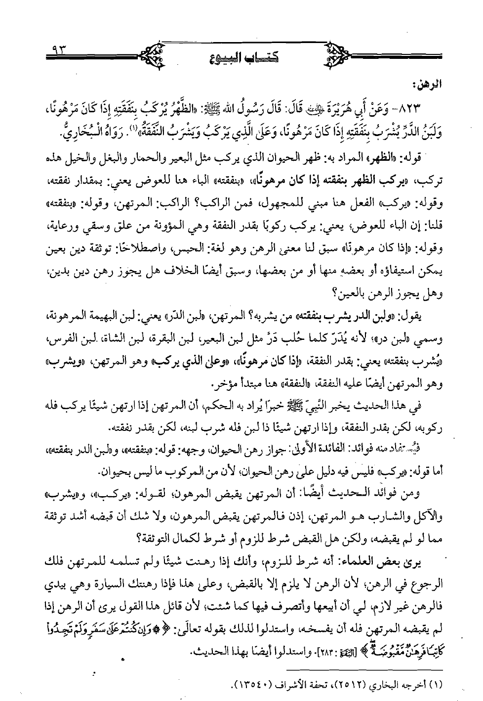 823 - وعن أبي هريرة رضي الله عنه قال: قال رسول الله صلى الله عليه وسلم: «الظهر يركب بنفقته إذا كان مرهونا، ولبن الدر يشرب بنفقته إذا كان مرهونا، وعلى الذين يركب ويشرب النفقة». رواه البخاري.