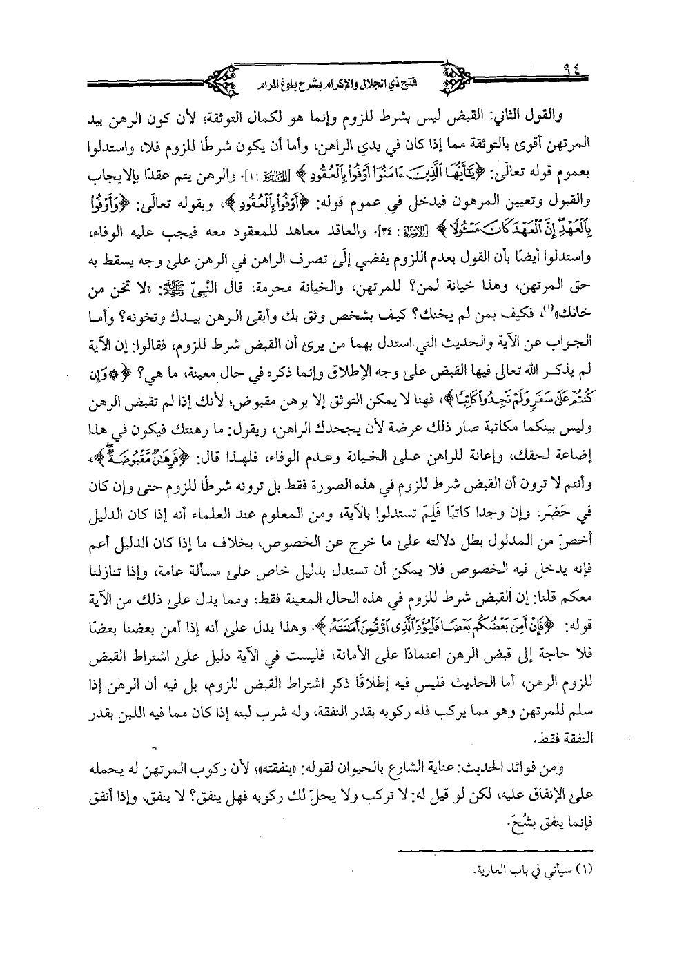 والقول الثاني: القبض ليس بشرط للزوم وإنما هو لكمال التوثقة؛ لأن كون الرهن بيد المرتهن أقوى بالتوثقة مما إذا كان في يدي الراهن، وأما أن يكون شرطا للزوم فلا، واستدولوا بعموم قوله تعالى: {يأيها الذين ءامنوا أوفوا بالعقود} [المائدة: 1]. والرهن يتم عقدا بالإيجاب والقبول وتعيين المرهون فيدخل في عموم قوله: {أوفوا بالعهد إن العهد كان مسئولا} [الإسراء: 34]. والعاقد معاهد للمعقود معه فيجب عليه الوفاء، واستدلوا أيضا بأن القول بعدم اللزوم يفضي إلى تصرف الراهن في الراهن على وجه يسقط به حق المرتهن، وهذا خيانة لمن؟ للمرتهن، والخيانة محرمة، قال النبي صلى الله عليه وسلم: «لا تخن من خانك»، فكيف بمن لمن يخنك؟ كيف بشخص وثق بك وأبقى الرهن بيدك وتخونه؟ وأما الجواب عن الآية والحديث التي استدل بهما من يرى أن القبض شرط للزوم، فقالوا: إن الآية لم يذكر الله تعالى فيها القبض على وجه الإطلاق وإنما ذكره في حال معينة، ما هي؟ {وإن كنتم على سفر ولم تجدوا كاتبا} [البقرة: 283]، فهنا لا يمكن التوثق إلا برهن مقبوض، لأنك إذا لم تقبض الرهن وليس بينكما مكاتبة صار ذلك عرضة لأن يجحدك الراهن، ويقول: ما رهنتك فيكون في هذا إضاعة لحقك، وإعادة للراهن على الخيانة وعدم الوفاء، فلهذا قال: {فرهان مقبوضة} [البقرة: 283]، وأنتم لا ترون أن القبض شرط للزوم في هذه الصورة فقط بل ترونه شرطا للزوم حتى وإن كان في حضر، وإن وجدا كاتبا فلم تستدلوا الآية، ومن المعلوم عند العلماء أنه إذا كان الدليل أخص من المدلول بطل دلالته على ما خرج عن الخصوص، بخلاف ما إذا كان الدليل أعم فإنه يدخل فيه الخصوص فلا يمكن أن تستدل بدليل خاص على مسألة عامة، وإذا تنازلنا معكم قلنا: إن القبض شرط للزوم في هذه الحال المعينة فقط، ومما يدل على ذلك من الآية قوله: {فإن أمن بعضكم بعضا فليود الذي اؤتمن أمانته} [البقرة: 283]. وهذا يدل على أنه إذا أمن بعضنا بعضا فلا حاجة إلى قبض الرهن اعتمادا على الأمانة، فليست في الآية دليل على اشتراط القبض للزوم الرهن، أما الحديث فليس فيه إطلاقا ذكر اشتراط القبض للزوم، بل فيه أن الرهن إذا سلم للمرتهن وهو مما يركب فله ركوبه بقدر النفقة، وله شرب لبنه إذا كان مما فيه اللبن بقدر النفقة فقط.