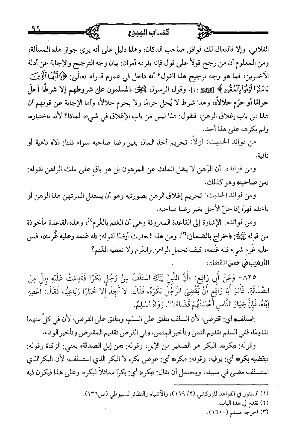 الفلاني، وإلا فالنعال لك فوافق صاحب الدكان، وهذا دليل على أنه يرى جواز هذه المسألة، ومن المعلوم أن من رجح قولا على قول فإنه يلزمه أمران: بيان وجه الترجيح والإجابة عن أدلة الآخرين، فما هو وجه ترجيح هذا القول؟ أنه داخل في عموم قوله تعالى: {يا أيها الذين آمنوا أوفوا بالعقود} [المائدة: 1]. وقول الرسول صلى الله عليه وسلم: «المسلمون على شروطهم إلا شرطا أخل حراما أو حرم حلالا»، وهذا شرط لا يحل حراما ولا يحرم حالا، وأما الإجابة عن قولهم أن هذا من باب إغلاق الرهن، فنقول: هذا ليس من باب الإغلاق في شيء، لماذا؟ لأنه باختياره، ولم يكرهه على هذا أحد.