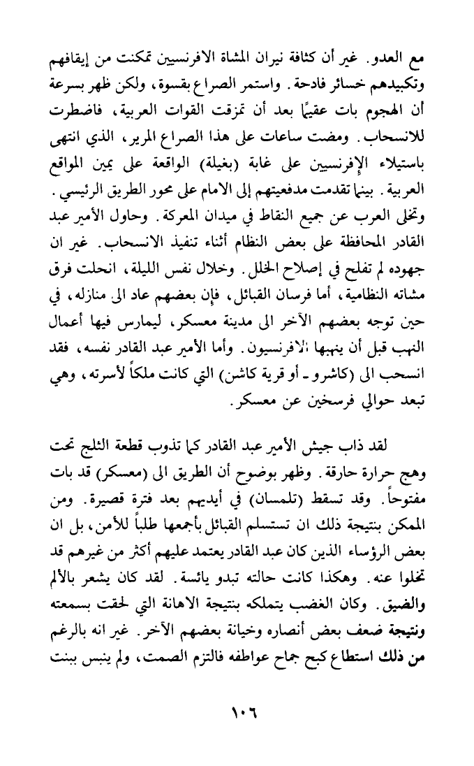 لقد ذاب جيش الأمير عبد القادر كما تذوب قطعة الثلج تحت وهج حرارة حارقة. وظهر بوضوح أن الطريق إلى (معسكر) قد بات مفتوحا. وقد سقط (تلمسان) في أيديهم بعد فترة قصيرة. ومن الممكن بنتيجة ذلك أن تستسلم القبائل بأجمعها طلبا للأمن، بل إن بعض الرؤساء الذين كان عبد القادر يعتمد عليهم أكثر من غيرهم قد تخلوا عنه. وهكذا كانت حالته تبدو يائسة. لقد كان يشعر بالألم والضيق. وكان الغضب يتملكه بنتيجة الإهانة التي لحقت بسمعته ونتيجة ضعف بعض أنصاره وخيانة بعضهم الآخر. غير أنه بالرغم من ذلك استطاع كبح جماح عواطفه فالتزم الصمت، ولم ينبس ببنت