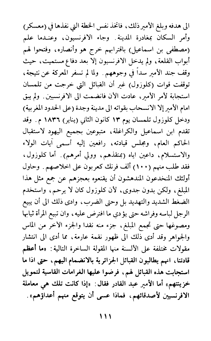 إلى هدفه وبلغ الأمير ذلك، فاتخذ نفس الخطة التي نفذها في (معسكر) وأمر السكان بمغادرة المدينة. وجاء الإفرنسيون، وعندما علم (مصطفى بن إسماعيل) باقترابهم خرج هو وأنصاره، وفتحوا لهم أبواب القلعة، ولم يدخل الإفرنسيون إلا بعد دفاع مستميت، حيث وقف جند الأمير سدا في وجوههم. ولما لم تسفر المعركة عن نتيجة، توقفت قوات (كلوزول) غير أن القبائل التي خرجت من تلمسان استجابة لأمر الأمير، عادت الآن فانضمت إلى الإفرنسيين. ولم يبق أمام الأمير إلا الانسحاب بقواته إلى مدينة وجدة (على الحدود المغربية) ودخل كلوزول تلمسان يوم 13 كانون الثاني (يناير) 1836 م. وقد تقدم ابن إسماعيل والكراغلة، متبوعين بجميع اليهود لاستقبال الحاكم العام، ومجلس قيادته، رافعين إليه أسمى آيات الولاء والإسلام، داعين إياه (بمنقذهم، وولي أمرهم). أما كلوزول، فقد طلب منهم (100) ألف فرنك كعربون على إخلاصهم. وحاول أولئك المنخدعون المندهشون أن يقنعوه بعجزهم عن جمع مثل هذا المبلغ، ولكن بدون جدوى، لأن كلوزول كان لا يرحم، واستخدم الضغط الشديد والتهديد بل وحتى الضرب، وأدى ذلك إلى أن يبيع الرجل لباسه وفراشه حتى يؤدي ما افترض عليه، وأن تبيع المرأة ثيابها ومصوغها حتى تجمع المبلغ، جزء منه نقدا والجزء الآخر من الماس والجواهر وقد أدى ذلك إلى ظهور نقمة عارمة، مما أدى إلى انتشار مقولات مختلفة على الألسنة منها المقولة الساخرة التالية: (ما أعظم قادتنا، إنهم يطالبون القبائل الجزائرية بالانضمام إليهم، حتى إذا ما استجابت هذه القبائل لهم، فرضوا عليها الغرامات القاسية لتمويل خزينتهم) أما الأمير عبد القادر فقال: (إذا كانت تلك هي معاملة الإفرنسيين لأصدقائهم، فماذا عسى أن يتوقع منهم أعداؤهم).