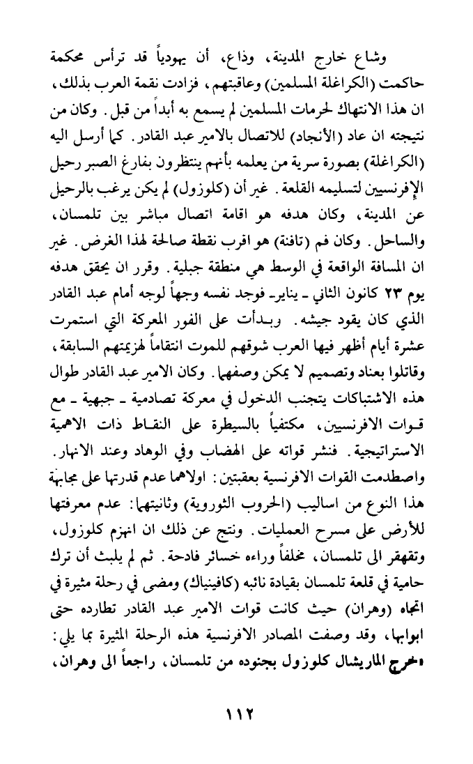 وشاع خارج المدينة، وذاع، أن يهوديا قد ترأس محكمة حاكمت (الكراغلة المسلمين) وعاقبتهم، فزادت نقمة العرب بذلك، أن هذا الانتهاك لحرمات المسلمين لم يسمع به أبدا من قبل. وكان من نتيجته أن عاد (الأنجاد) للاتصال بالأمير عبد القادر. كما أرسل إليه (الكراغلة) بصورة سرية من يعلمه بأنهم ينتظرون بفارغ الصبر رحيل الإفرنسيين لتسليمه القلعة. غير أن (كلوزول) لم يكن يرغب بالرحيل عن المدينة، وكان هدفه هو إقامة اتصال مباشر بين تلمسان، والساحل. وكان فم (تافنة) هو أقرب نقطة صالحة لهذا الغرض. غير أن المسافة الواقعة في الوسط هي منطقة جبلية. وقرر أن يحقق هدفه يوم 23 كانون الثاني - يناير - فوجد نفسه وجها لوجه أمام عبد القادر الذي كان يقود جيشه. وبدأت على الفور المعركة التي استمرت عشرة أيام أظهر فيها العرب شوقهم للموت انتقاما لهزيمتهم السابقة، وقاتلوا بعناد وتصميم لا يمكن وصغهما. وكان الأمير عبد القادر طوال هذه الاشتباكات يتجنب الدخول في معركة تصادمية - جبهية - مع قوات الإفرنسيين، مكتفيا بالسيطرة على النقاط ذات الأهمية الاستراتيجية. فنشر قواته على الهضاب وفي الوهاد وعند الأنهار. واصطدمت القوات الإفرنسية بعقبتين: أولاهما عدم قدرتها على مجابهة هذا النوع من أساليب (الحروب الثوروية) وثانيتهما: عدم معرفتها للأرض على مسرح العمليات. ونتج عن ذلك أن انهزم كلوزول، وتقهقر إلى تلمسان، مخلفا وراءه خسائر فادحة. ثم لم يلبث أن ترك حامية في قلعة تلمسان بقيادة نائبه (كافينياك) ومضى في رحلة مثيرة في اتجاه (وهران) حيث كانت قوات الأمير عبد القادر تطارده حتى أبوابها، وقد وصفت المصادر الإفرنسية هذه الرحلة المثيرة بما يلي: (خرج الماريشال كلوزول بجنوده من تلمسان، راجعا إلى وهران،