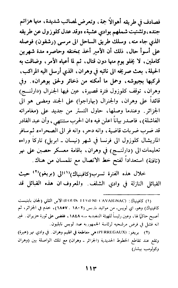 خلال هذه الفترة تسرب (كافينياك) (¬1) إلى (بريغو) (¬2) حيث القبائل النازلة في وادي الشلف. والمعروف أن هذه القبائل قد