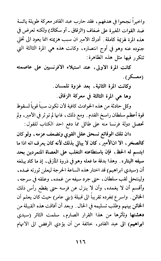 (إن تلك الوقائع تسحق عقل القوي وتضعف عزمه، ولو كان كالصخر، إلا أن الأمير، كان لا يبالي بذلك لأنه كان يعرف أنه إذا ما ابتسم له الحظ، فإن باستطاعته التغلب على العصاة المتمردين بحد سيفه البتار). وهذا بدقة ما فعله وهو في ذروة المأزق، إذ ما كاد يبلغه أن (سيدي إبراهيم) قد اختار هذه الساعة الحرجة ليعلن ثورته ضده، ولينتحل لقب سلطان، حتى جرد سيفه من غمده، وعلقه في سرجه، وأقسم أن لا يغمده، وأن لا ينزل عن فرسه حتى يقطع رأس ذلك الخائن. وأسرع بمفرده تقريبا إلى قبيلة (بني عامر) حيث كان يعلم أن الخائن بينهم وطلب تسليمه في الحال. وبعد أن أفاقت هذه القبيلة من دهشتها وتأثرها من هذا القرار الصارم، سلمت الثائر (سيدي إبراهم) إلى عبد القادر، خائفة من أن يؤدي الرفض إلى الاتهام