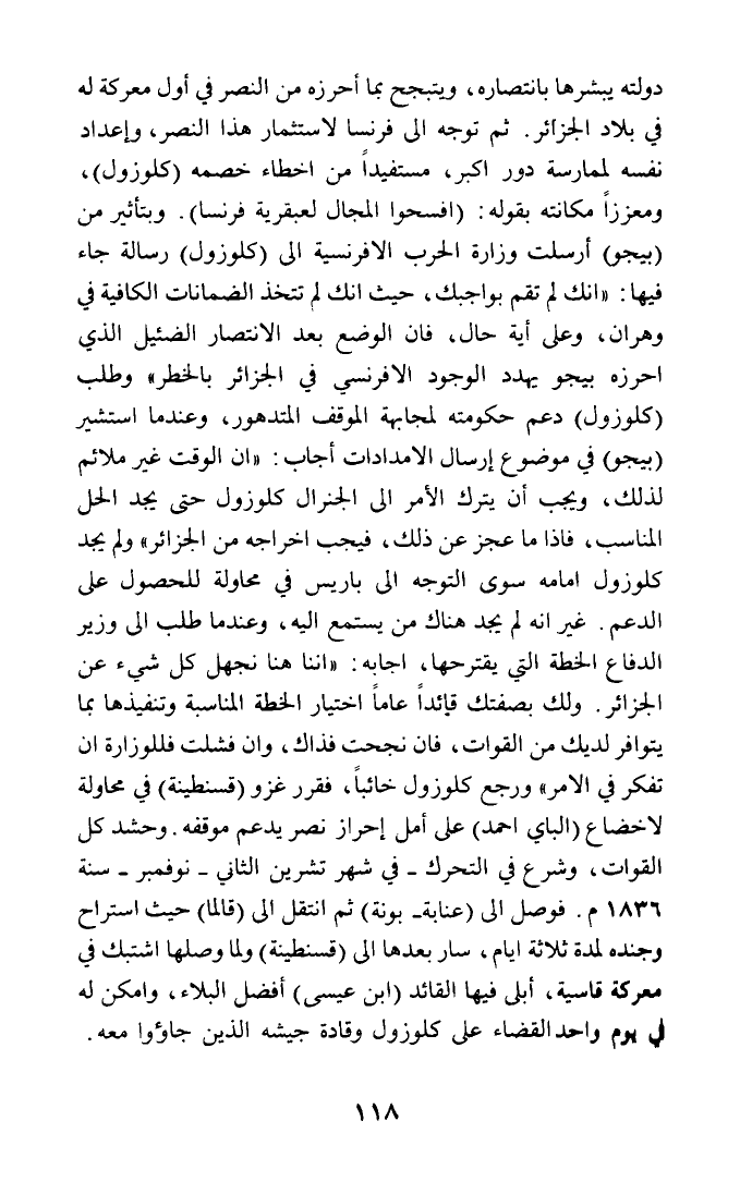 دولته يبشرها بانتصاره، ويتبجح بما أحرزه من النصر في أول معركة له في بلاد الجزائر. ثم توجه إلى فرنسا لاستثمار هذا النصر، وإعداد نفسه لممارسة دور أكبر، مستفيدا من أخطاء خصمه (كلوزول)، ومعززا مكانته بقوله: (افسحوا المجال لعبقرية فرنسا). وبتأثير من (بيجو أرسلت وزارة الحرب الإفرنسية إلى (كلوزول) رسالة جاء فيها: (إنك لم تقم بواجبك، حيث أنك لم تتخذ الضمانات الكافية في وهران، وعلى أية حال، فإن الوضع بعد الانتصار الضئيل الذي أحرزه بيجو يهدد الوجود الإفرنسي في الجزائر بالخطر) وطلب (كلوزول) دعم حكومته لمجابهة الموقف المتدهور، وعندما استشير (بيجو في موضوع إرسال الإمدادات أجاب: (إن الوقت غير ملائم لذلك، ويجب أن يترك الأمر إلى الجنرال كلوزول حتى يجد الحل المناسب، فإذا ما عجز عن ذلك، فيجب إخراجه من الجزائر. ولم يجد كلوزول أمامه سوى التوجه إلى باريس في محاولة للحصول على الدعم. غير أنه لم يجد هناك من يستمع إليه، وعندما طلب إلى وزير الدفاع الخطة التي يقترحها، أجابه: (إننا هنا نجهل كل شيء عن الجزائر. ولك بصفتك قائدا عاما اختيار الخطة المناسبة وتنفيذها بما يتوافر لديك من القوات، فإن نجحت فذاك، وإن فشلت فللوزارة أن تفكر في الأمر) ورجع كلوزول خائبا، فقرر غزو (قسنطينة) في محاولة لإخضاع (الباي أحمد) على أمل إحراز نصر يدعم موقفه. وحشد كل القوات، وشرع في التحرك - في شهر تشرين الثاني - نوفمبر - سنة 1836 م. فوصل إلى (عنابة - بونة) ثم انتقل إلى (قالما) حيث استراح وجنده لمدة ثلاثة أيام، سار بعدها إلى (قسنطينة) ولما وصلها اشتبك في معركة قاسية، أبلى فيها القائد (ابن عيسى) أفضل البلاء، وأمكن له في يوم واحد القضاء على كلوزول وقادة جيشه الذين جاؤوا معه.