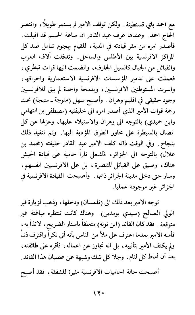 مع أحمد باي قسنطينة. ولكن توقف الأمير لم يستمر طويلا، وانتصر الحاج أحمد. وعندها عرف عبد القادر أن ساعة الحسم قد أقبلت. فأصدر أمره من مقر قيادته في المدية، للقيام بهجوم شامل ضد كل المراكز الإفرنسية بين الأطلس والساحل. وتدفقت آلاف العرب والقبائل من الجبال كالسيل الجارف، وانضمت إليها قوات تيطري، فعملت على تدمير المؤسسات الإفرنسية الاستعمارية وإحراقها، وأسرات المستوطنين الإفرنسيين، وبلمحة واحدة لم يبق للإفرنسيين وجود حقيقي في إقليم وهران. وأصبح سهل (متوجة - متيجة) تحت رحمة قوات الأمير الذي أصدر أمره إلى خليفيه (مصطفى بن التهامي وابن حميدي) بالتوجه إلى وهران والاستيلاء عليها، وعزلها عن كل اتصال بالسيطرة على محاور الطرق المؤدية إليها. وتم تنفيذ ذلك بنجاح. وفي الوقت ذاته كلف الأمير عبد القادر خليفته (محمد بن علال) بالتوجه إلى الجزائر، فأشعل نارا حامية على قيادة الجيش هناك، وضيق على القبائل المتنصرة، بل على الإفرنسيين أنفسهم، وسار حتى دخل مدينة الجزائر ذاتتها. وأصبحت القيادة الإفرنسية في الجزائر غير موجودة عمليا , توجه الأمير بعد ذلك إلى (تلمسان) ودخلها، وذهب لزيارة قبر الولي الصالح (سيدي
