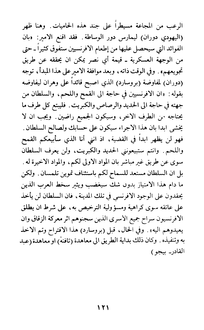 الرعب من المجاعة مسيطرا على جند هذه الحاميات. وهنا ظهر (اليهودي دوران) ليمارس دور الوساطة. فقد أقنع الأمير: (بأن الفوائد التي سيحصل عليها من إطعام الإفرنسيين ستفوق كثيرا - حتى من الوجهة العسكرية - قيمة أي نصر يمكن أن يحققه عن طريق تجويعهم). وفي الوقت ذاته، وبعد موافقة الأمير على هذا المبدأ، توجه (دوران) لمفاوضة (بروسارد) الذي أصبح قائدا على وهران ليفاوضه بقوله: (إن الإفرنسيين في حاجة إلى القمح واللحم، والسلطان من جهته في حاجة إلى الحديد والرصاص والكبريت. فليبتع كل طرف ما يحتاجه من الطرف الآخر، وسيكون الجميع راضين. ويجب أن لا يخشى أبدا بأن هذا الإجراء سيكون على حسابك ولصالح السلطان. فهو لن يظهر أبدا في القضية، إذ إنني أنا الذي سأبيعكم القمح واللحم. وأنتم ستبيعونني الحديد والكبريت، ولن يعرف السلطان سوى عن طريق غير مباشر بأن المواد الأولى لكم، والمواد الأخيرة له.