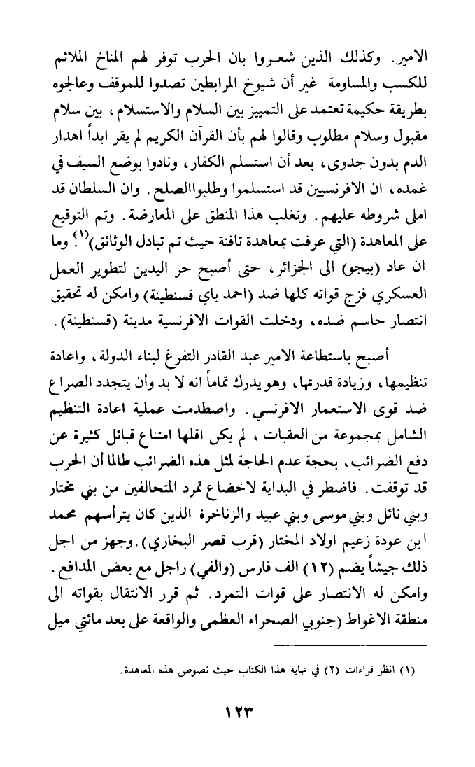 الأمير. وكذلك الذين شعروا بأن الحرب توفر لهم المناخ الملائم للكسب والمساومة غير أن شيوخ المرابطين تصدوا للموقف وعالجوه بطريقة حكيمة تعتمد على التمييز بين السلام والاستسلام، بين سلام مقبول وسلام مطلوب وقالوا لهم بأن القرآن الكريم لم يقر أبدا إهدار الدم بدون جدوى، بعد أن استسلم الكفار، ونادوا بوضع السيف في غمده، إن الإفرنسيين قد استسلموا وطلبوا الصلح. وأن السلطان قد أملى شروطه عليهم. وتغلب هذا المنطق على المعارضة. وتم التوقيع على المعاهدة (التي عرفت بمعاهدة تافنة حيث تم تبادل الوثائق) (¬1). وما أن عاد (بيجو إلى الجزائر، حتى أصبح حر اليدين لتطوير العمل العسكري فزج قواته كلها ضد (أحمد باي قسنطينة) وأمكن له تحقيق انتصار حاسم ضده، ودخلت القوات الإفرنسية مدينة (قسنطينة).