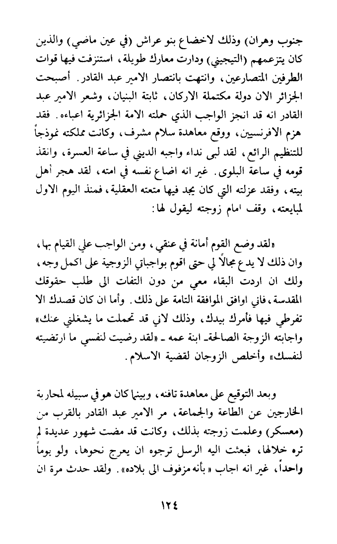 جنوب وهران) وذلك لإخضاع بنو عراش (في عين ماضي) والذين كان يتزعمهم (التيجيني) ودارت معارك طويلة، استنزفت فيها قوات الطرفين المتصارعين، وانتهت بانتصار الأمير عبد القادر. أصبحت الجزائر الآن دولة مكتملة الأركان، ثابتة البنيان، وشعر الأمير عبد القادر أنه قد أنجز الواجب الذي حملته الأمة الجزائرية أعباءه. فقد هزم الإفرنسيين، ووقع معاهدة سلام مشرف، وكانت مملكته نموذجا للتنظيم الرائع، لقد لبى نداء واجبه الديني في ساعة العسرة، وأنقذ قومه في ساعة البلوى. غير أنه أضاع نفسه في أمته، لقد هجر أهل بيته، وفقد عزلته التي كان يجد فيها متعته العقلية، فمنذ اليوم الأول لمبايعته، وقف أمام زوجته ليقول لها: