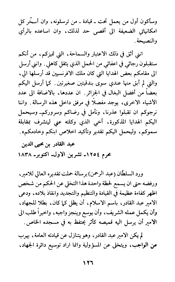 إنني أثق في ذلك الاعتبار والسماحة، التي تميزكم، من أنكم ستقبلون رجائي في إعفائي من الحمل الذي يثقل كاهلي. وإنني أرسل إلى مقامكم بعض الهدايا التي كان ملك الإفرنسيين قد أرسلها إلي، والتي لم أبق منها عندي سوى بندقيتين صغيرتين. كما أرسل إليكم بعضا من أفضل البغال في الجزائر. إن عددها، بالإضافة إلى عدد الأشياء الأخرى، يوجد مفصلا في مرفق داخل هذه الرسالة. وإننا نرجوكم أن تقبلوا عذرنا، ونأمل في رضاكم وسروركم - وسيحمل إليكم الهدايا المذكورة، أخي الذي وكلته عني ليتشرف بمقابلة سموكم، وليحمل إليكم تقدير وتأكيد إخلاص ابنكم وخادمكم).