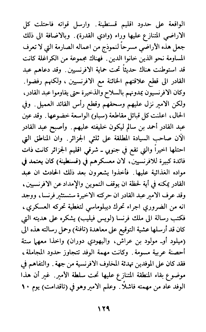 الواقعة على حدود إقليم قسنطينة. وأرسل قواته فاحتلت كل الأراضي المتنازع عليها وراء (وادي القدرة). وبالإضافة إلى ذلك جعل هذه الأراضي مسرحا لنموذج من أعماله الصارمة التي لا تعرف المساومة نحو الذين خانوا الدين. فهناك مجموعة من الكراغلة كانت قد استوطنت هناك حديثا تحت حماية الإفرنسيين. وقد دعاهم عبد القادر إلى قطع علاقتهم الخائنة مع الإفرنسيين، ولكنهم رفضوا. وكان الإفرنسيون يمدونهم بالسلاح والذخيرة حتى يقاوموا عبد القادر، ولكن الأمير نزل عليهم وسحقهم وقطع رأس القائد العميل. وفي الحال، أعلنت كل قبائل مقاطعة (سباو) الواسعة خضوعها. وقد عين عبد القادر أحمد بن سالم ليكون خليفته عليهم. وأصبح عبد القادر الآن صاحب السيادة المطلقة على ثلثي الجزائر. وأن المناطق التي احتلها أخيرا والتي تقع في جنوبي - شرقي إقليم الجزائر كانت ذات فائدة كبيرة للإفرنسيين، لأن معسكرهم في (قسنطينة) كان يعتمد في مواده الغذائية عليها. فأخذوا يشعرون بعد ذلك الحادث أن عبد القادر يمكنه في أية لحظة أن يوقف التموين والإمداد عن الإفرنسيين، وقد عرف الأمير عبد القادر أن حركته الأخيرة ستستثير فرنسا، ووجد أنه من الضروري إجراء تحرك ديبلوماسي لتغطية تحركه العسكري، فكتب رسالة إلى ملك فرسا (لويس فيليب) يشكره على هديته التي كان قد أرسلها عشية التوقيع على معاهدة (تافنة) وحمل رسالته هذه إلى (ميلود أو - مولود بن عراش، واليهودي دوران) وأخذا معهما ستة أحصنة عربية مسومة. وكانت مهمة الوفد تتجاوز حدود المجاملة، فقد كان على الموفدين تهدئة المخاوف الإفرنسية من جهة. والتفاهم في موضوع بقاء المنطقة المتنازع عليها تحت سلطة الأمير. غير أن هذا الوفد عاد من مهمته فاشلا. وعلم الأمير وهو في (تاقدامت) يوم 10