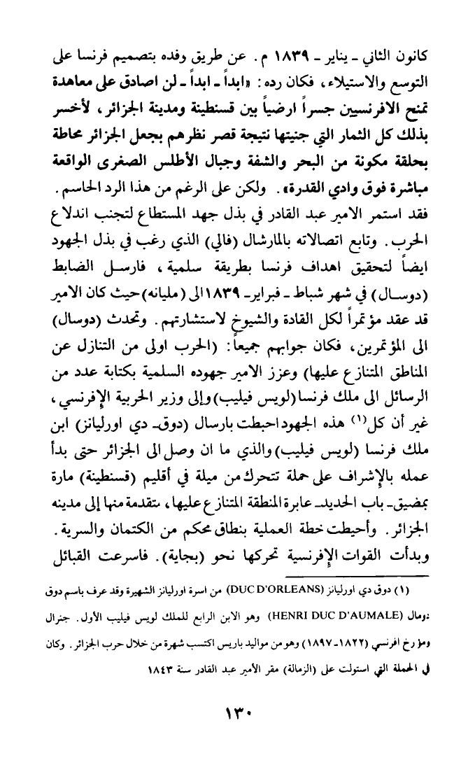 (¬1) دوق دي أورليانز (DUC D'ORLEANS) من أسرة أورليانز الشهيرة وقد عرف باسم دوق دومال (HENRI DUC D'AUMALE) وهو الإبن الرابع للملك لويس فيليب الأول. جنرال ومؤرخ إفرنسي (1822 - 1897) وهو من مواليد باريس اكتسب شهرة من خلال حرب الجزائر. وكان في الحملة التي استولت على (الزمالة) مقر الأمير عبد القادر سنة 1843.