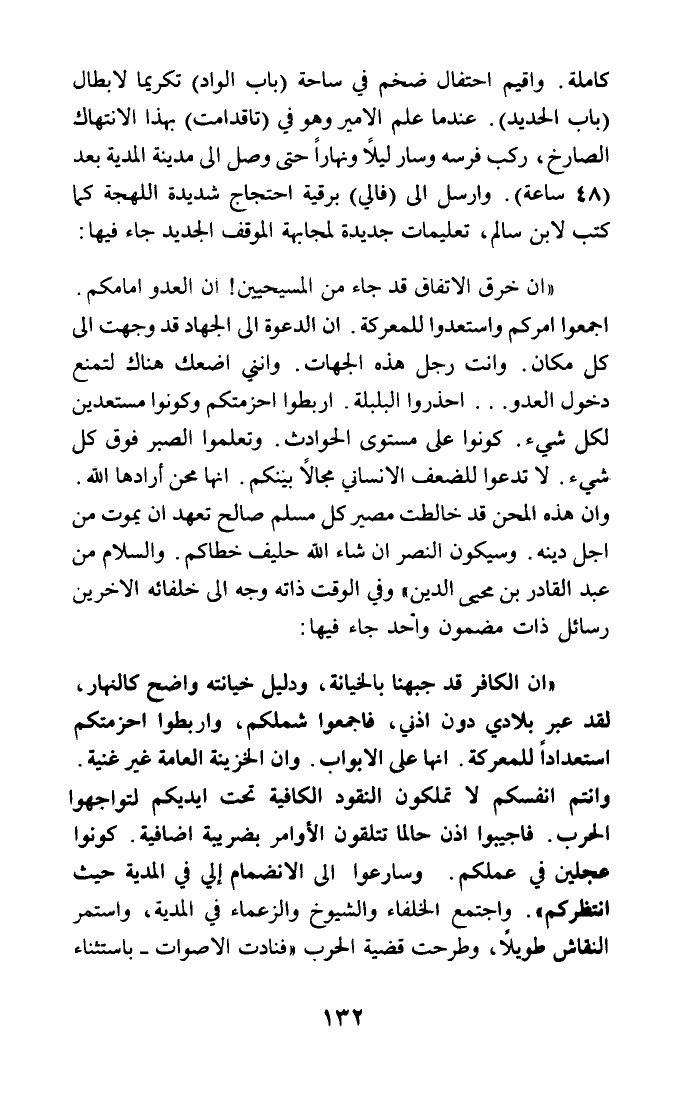 (إن الكافر قد جبهنا بالخيانة، ودليل خيانته واضح كالنهار، لقد عبر بلادي دون إذني، فاجمعوا شملكم، واربطوا أحزمتكم استعدادا للمعركة. إنها على الأبواب. وأن الخزينة العامة غير غنية. وأنتم أنفسكم لا تملكون النقود الكافية تحت أيديكم لتواجهوا الحرب. فأجيبوا إذن حالما تتلقون الأوامر بضريبة إضافية. كونوا عجلين في عملكم. وسارعوا إلى الانضمام إلي في المدية حيث أنتظركم). واجتمع الخلفاء والشيوخ والزعماء في المدية، واستمر النقاش طويلا، وطرحت قضية الحرب (فنادت الأصوات - باستثناء