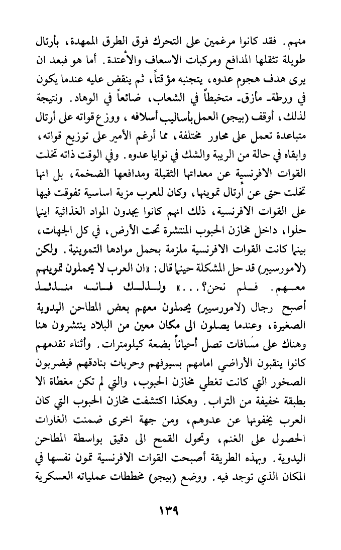 منهم. فقد كانوا مرغمين على التحرك فوق الطرق الممهدة، بأرتال طويلة تثقلها المدافع ومركبات الإسعاف والأعتدة. أما هو فبعد أن يرى هدف هجوم عدوه، يتجنبه مؤقتا، ثم ينقض عليه عندما يكون في ورطة - مأزق - متخبطا في الشعاب، ضائعا في الوهاد. ونتيجة لذلك، أوقف (بيجو) العمل بأساليب أسلافه، ووزع قواته على أرتال متباعدة تعمل على محاور مختلفة، مما أرغم الأمير على توزيع قواته، وإبقاه في حالة من الريبة والشك في نوايا عدوه. وفي الوقت ذاته تخلت القوات الإفرنسية عن معداتها الثقيلة ومدافعها الضخمة، بل إنها تخلت حتى عن أرتال تموينها، وكان للعرب مزية أساسية تفوقت فيها على القوات الإفرنسية، ذلك أنهم كانوا يجدون المواد الغذائية أينما حلوا، داخل مخازن الحبوب المنتشرة تحت الأرض، في كل الجهات، بينما كانت القوات الإفرنسية ملزمة بحمل موادها التموينية. ولكن (لامورسيير) قد حل المشكلة حينما قال: (إن العرب لا يحملون تموينهم معهم. فلم نحن؟ ...) ولذلك فإنه منذئذ أصبح رجال (لامورسيير) يحملون معهم بعض المطاحن اليدوية الصغيرة، وعندما يصلون إلى مكان معين من البلاد ينتشرون هنا وهناك على مسافات تصل أحيانا بضعة كيلومترات. وأثناء تقدمهم كانوا ينقبون الأراضي أمامهم بسيوفهم وحربات بنادقهم فيضربون الصخور التي كانت تغطي مخازن الحبوب، والتي لم تكن مغطاة إلا بطبقة خفيفة من التراب. وهكذا اكتشفت مخازن الحبوب التي كان العرب يخفونها عن عدوهم، ومن جهة أخرى ضمنت الغارات الحصول على الغنم، وتحول القمح إلى دقيق بواسطة المطاحن اليدوية. وبهذه الطريقة أصبحت القوات الإفرنسية تمون نفسها في المكان الذي توجد فيه. ووضع (بيجو) مخططات عملياته العسكرية