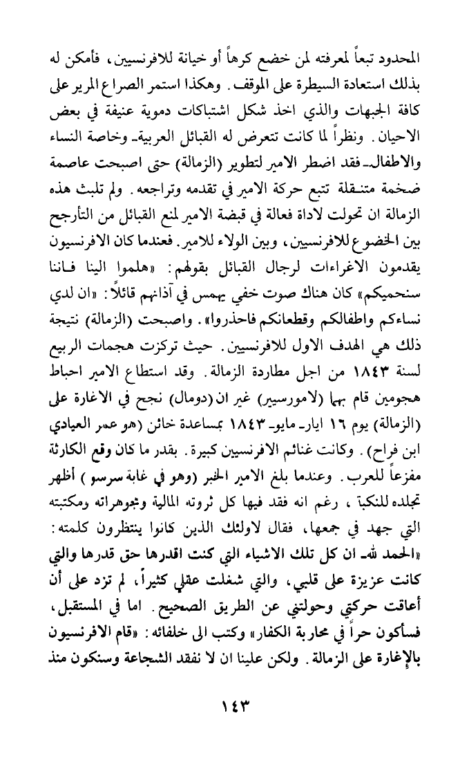 المحدود تبعا لمعرفته لمن خضع كرها أو خيانة للإفرنسيين، فأمكن له بذلك استعادة السيطرة على الموقف. وهكذا استمر الصراع المرير على كافة الجبهات والذي أخذ شكل اشتباكات دموية عنيفة في بعض الأحيان. ونظرا لما كانت تتعرض له القبائل العربية - وخاصة النساء والأطفال - فقد اضطر الأمير لتطوير (الزمالة) حتى أصبحت عاصمة ضخمة متنقلة تتبع حركة الأمير في تقدمه وتراجعه. ولم تلبث هذه الزمالة أن تحولت لإداة فعالة في قبضة الأمير لمنع القبائل من التأرجح بين الخضوع للإفرنسيين، وبين الولاء للأمير. فعندما كان الإفرنسيون يقدمون الإغراءات لرجال القبائل بقولهم: (هلموا إلينا فإننا سنحميكم) كان هناك صوت خفي يهمس في آذانهم قائلا: (إن لدي نساءكم وأطفالكم وقطعانكم فاحذروا). وأصبحت (الزمالة) نتيجة ذلك هي الهدف الأول للإفرنسيين. حيث تركزت هجمات الربيع لسنة 1843 من أجل مطاردة الزمالة. وقد استطاع الأمير إحباط هجومين قام بهما (لامورسيير) غير أن (دومال) نجح في الإغارة على (الزمالة) يوم 16 أيار - مايو - 1843 بمساعدة خائن (هو عمر العيادي ابن فراح). وكانت غنائم الإفرنسيين كبيرة. بقدر ما كان وقع الكارثة مفزعا للعرب. وعندما بلغ الأمير الخبر (وهو في غابة سرسو) أظهر تجلده للنكبة، رغم أنه فقد فيها كل ثروته المالية ومجوهراته ومكتبته التي جهد في جمعها، فقال لأولئك الذين كانوا ينتظرون كلمته: (الحمد لله - إن كل تلك الأشياء التي كنت أقدرها حق قدرها والتي كانت عزيزة على قلبي، والتي شغلت عقلي كثيرا، لم تزد على أن أعاقت حركتي وحولتني عن الطريق الصحيح. أما في المستقبل، فسأكون حرا في محاربة الكفار) وكتب إلى خلفائه: (قام الإفرنسيون بالإغارة على الزمالة. ولكن علينا أن لا نفقد الشجاعة وسنكون منذ
