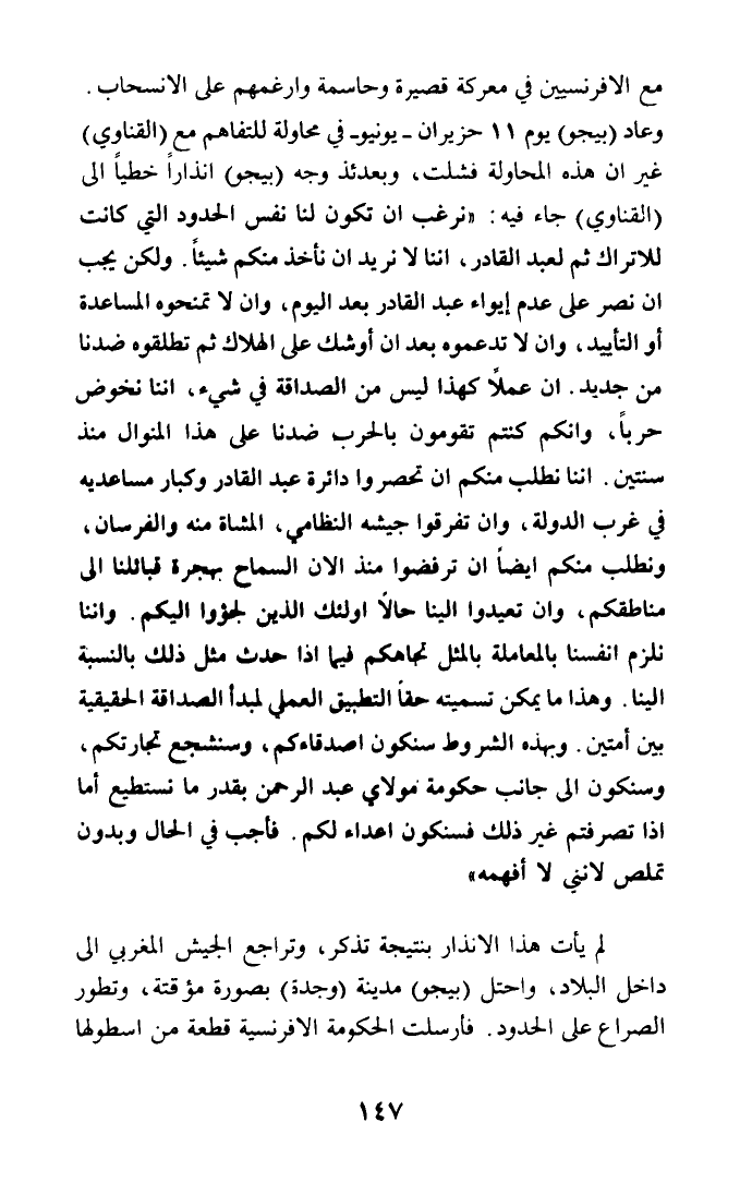 مع الإفرنسيين في معركة قصيرة وحاسمة وأرغمهم على الانسحاب. وعاد (بيجو يوم 11 حزيران - يونيو - في محاولة للتفاهم مع (القناوي) غير أن هذه المحاولة فشلت، وبعدئذ وجه (بيجو) إنذارا خطيا إلى (القناوي) جاء فيه: (نرغب أن تكون لنا نفس الحدود التي كانت للأتراك ثم لعبد القادر، إننا لا نريد أن نأخذ منكم شيئا. ولكن يجب أن نصر على عدم إيواء عبد القادر بعد اليوم، وأن لا تمنحوه المساعدة أو التأييد، وأن لا تدعموه بعد أن أوشك على الهلاك ثم تطلقوه ضدنا من جديد. إن عملا كهذا ليس من الصداقة في شيء، إننا نخوض حربا، وإنكم كنتم تقومون بالحرب ضدنا على هذا المنوال منذ سنتين. إننا نطلب منكم أن تحصروا دائرة عبد القادر وكبار مساعديه في غرب الدولة، وأن تقرقوا جيشه النظامي، المشاة منه والفرسان، ونطلب منكم أيضا أن ترفضوا منذ الآن السماح بهجرة قبائلنا إلى مناطقكم، وأن تعيدوا إلينا حالا أولئك الذين لجؤوا إليكم. وإننا نلزم أنفسنا بالمعاملة بالمثل تجاهكم فيما إذا حدث مثل ذلك بالنسبة إلينا. وهذا ما يمكن تسميته حقا التطبيق العملي لمبدأ الصداقة الحقيقية بين أمتين. وبهذه الشروط سنكون أصدقاءكم، وسنشجع تجارتكم، وسنكون إلى جانب حكومة مولاي عبد الرحمن بقدر ما نستطيع أما إذا تصرفتم غير ذلك فسنكون أعداء لكم. فأجب في الحال وبدون تملص لأنني لا أفمه).