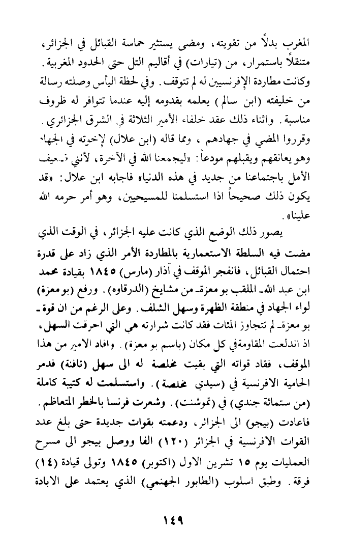 يصور ذلك الوضع الذي كانت عليه الجزائر، في الوقت الذي مضت فيه السلطة الاستعمارية بالمطاردة الأمر الذي زاد على قدرة احتمال القبائل، فانفجر الموقف في آذار (مارس) 1845 بقيادة محمد ابن عبد الله - الملقب بومعزة - من مشايخ (الدرقاوه). ورفع (بومعزة) لواء الجهاد في منطقة الظهرة وسهل الشلف. وعلى الرغم من أن قوة - بومعزة - لم تتجاوز المئات فقد كانت شرارته هى التي أحرقت السهل، إذ اندلعت المقاومة في كل مكان (باسم بو معزة). وأفاد الأمير من هذا الموقف، فقاد قواته التي بقيت مخلصة له إلى سهل (تافنة) فدمر الحامية الإفرنسية في (سيدي مخلصة). واستسلمت له كتيبة كاملة (من ستمائة جندي) في (تموشنت). وشعرت فرنسا بالخطر المتعاظم. فأعادت (بيجو) إلى الجزائر، ودعمته بقوات جديدة حتى بلغ عدد القوات الإفرنسية في الجزائر (120) ألفا ووصل بيجو إلى مسرح العمليات يوم 15 تشرين الأول (أكتوبر) 1845 وتولى قيادة (14) فرقة. وطبق أسلوب (الطابور الجهنمي) الذي يعتمد على الإبادة