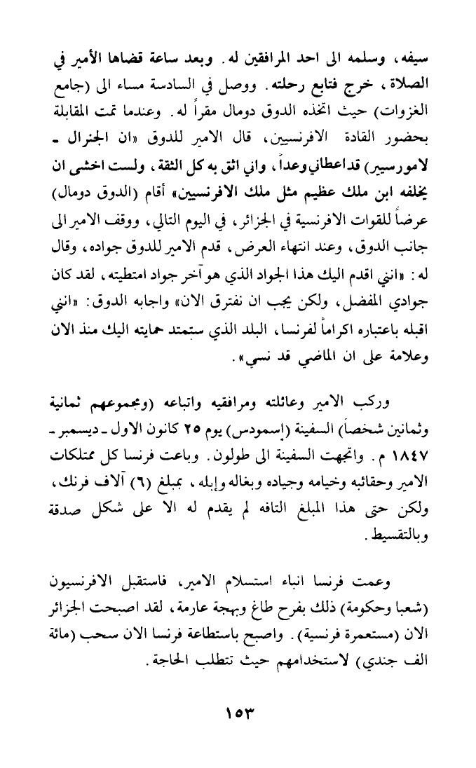 سيفه، وسلمه إلى أحد المرافقين له. وبعد ساعة قضاها الأمير في الصلاة، خرج فتابع رحلته. ووصل في السادسة مساء إلى (جامع الغزوات) حيث اتخذه الدوق دومال مقرا له. وعندما تمت المقابلة بحضور القادة الإفرنسيين، قال الأمير للدوق (أن الجنرال - لامورسيير) قد أعطاني وعدا، وإني أثق به كل الثقة، ولست أخشى أن يخلفه ابن ملك عظيم مثل ملك الإفرنسيين) أقام (الدوق دومال) عرضا للقوات الإفرنسية في الجزائر، في اليوم التالي، ووقف الأمير إلى جانب الدوق، وعند انتهاء العرض، قدم الأمير للدوق جواده، وقال له: (إنني أقدم إليك هذا الجواد الذي هو آخر جواد امتطيته، لقد كان جوادي المفضل، ولكن يحب أن نفترق الآن) وأجابه الدوق: (إنني أقبله باعتباره إكراما لفرنسا، البلد الذي ستمتد حمايته إليك منذ الآن وعلامة على أن الماضي قد نسي).