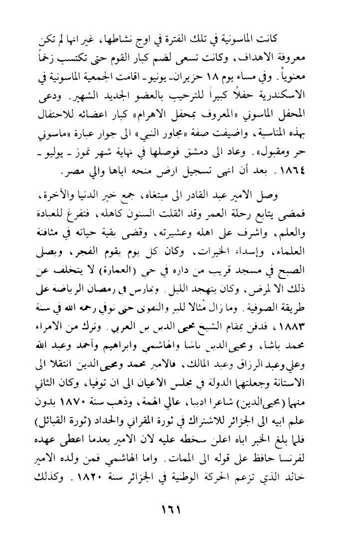 كانت الماسونية في تلك الفترة في أوج نشاطها، غير أنها لم تكن معروفة الأهداف، وكانت تسعى لضم كبار القوم حتى تكتسب زخما معنويا. وفي مساء يوم 18 حزيران - يونيو - أقامت الجمعية الماسونية في الإسكندرية حفلا كبيرا للترحيب بالعضو الجديد الشهير. ودعى المحفل الماسوني (المعروف بمحفل الأهرام) كبار أعضائه للاحتفال بهذه المناسبة، وأضيفت صفة , (مجاور النبي) إلى جوار عبارة (ماسوني حر ومقبول). وعاد إلى دمشق فوصلها في نهاية شهر تموز - يوليو - 1864 بعد أن أنهى تسجيل أرض منحه إياها والي مصر.