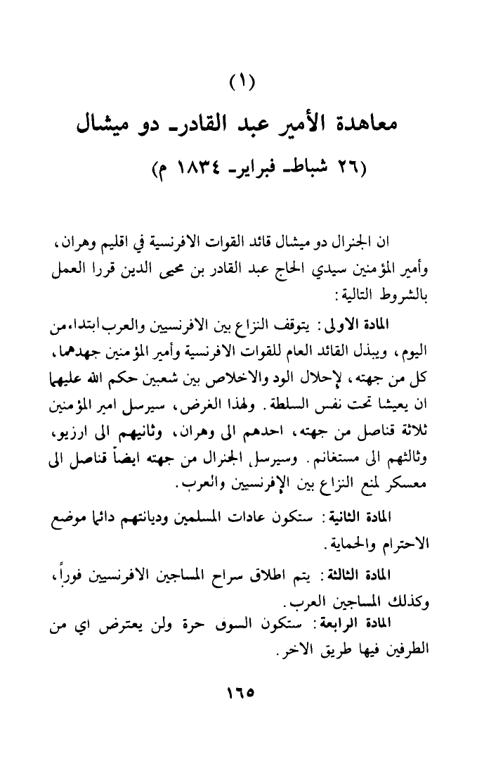 إن الجنرال دوميشال قائد القوات الإفرنسية في إقليم وهران، وأمير المؤمنين سيدي الحاج عبد القادر بن محيي الدين قررا العمل بالشروط التالية: