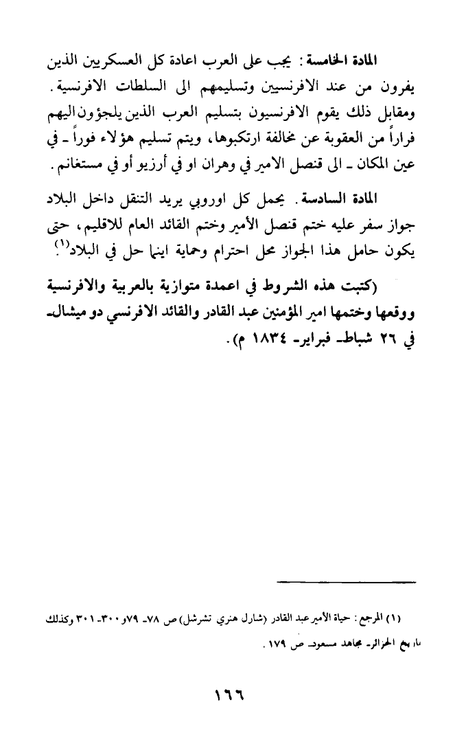 (كتبت هذه الشروط في أعمدة متوازية بالعربية والإفرنسية ووقعها وختمها أمير المؤمنين عبد القادر والقائد الإفرنسي دوميشال - في 26 شباط - فبراير - 1834 م).