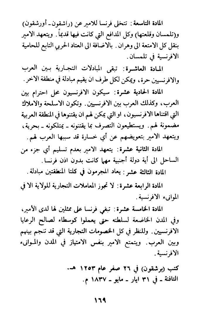 المادة التاسعة: تتخلى فرنسا للأمير عن (راشقون - أورشقرن) و (تلمسان