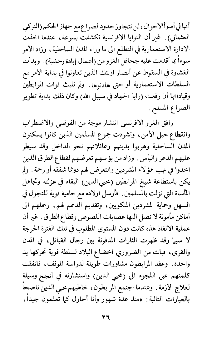 أنها في أسوأ الأحوال، لن تتجاوز حدود الصراع مع جهاز الحكم (التركي العثماني). غير أن النوايا الإفرنسية تكشفت بسرعة، عندما أخذت الإدارة الاستعمارية في التطلع إلى ما وراء المدن الساحلية، وزاد الأمر سوءا بما أقدمت عليه جحافل الغزو من (أعمال إبادة وحشية). وبدأت الغشاوة في السقوط عن أبصار أولئك الذين تعاونوا في بداية الأمر مع السلطات الاستعمارية أو حتى هادنوها. ولم تلبث قوات المرابطين وقياداتها أن رفعت (راية الجهاد في سبيل الله) وكان ذلك بداية تطوير الصراع المسلح.
