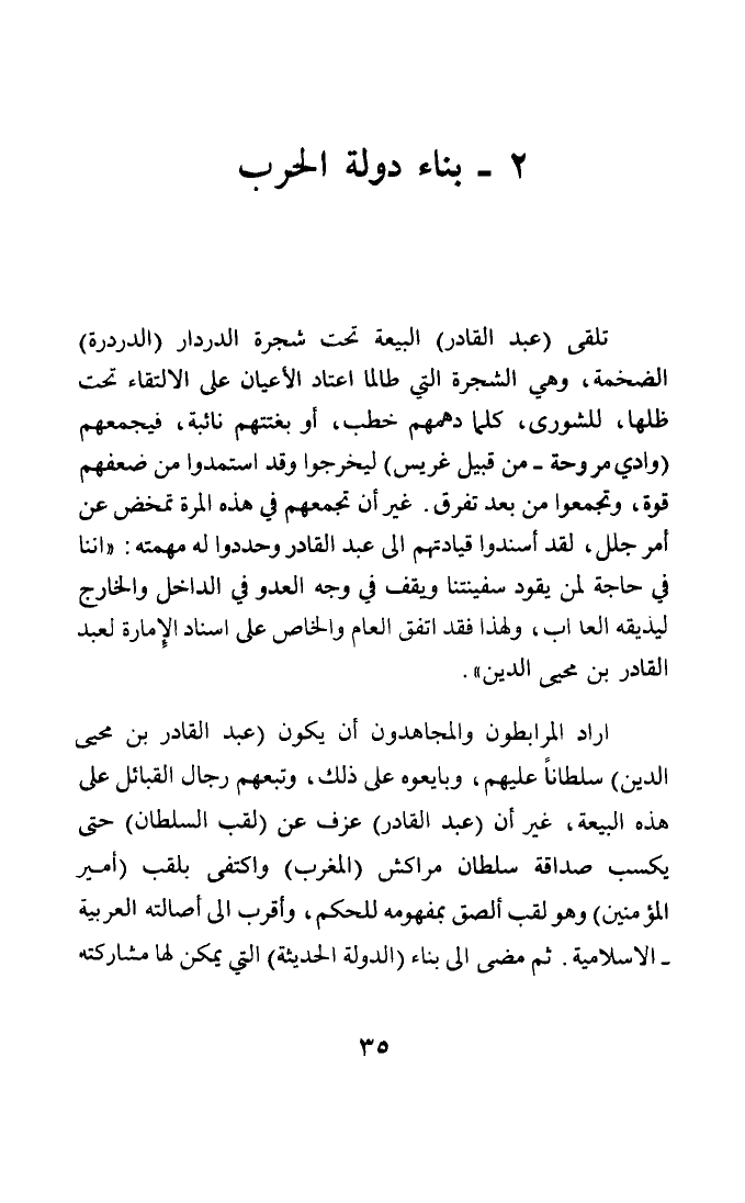 تلقى (عبد القادر) البيعة تحت شجرة الدردار (الدردرة) الضخمة، وهي الشجرة التي طالما اعتاد الأعيان على الالتقاء تحت ظلها، للشورى، كلما دهمهم خطب، أو بغتتهم نائبة، فيجمعهم (وادي مروحة - من قبيل غرس) ليخرجوا وقد استمدوا من ضعفهم قوة، وتجمعوا من بعد تفرق. غير أن تجمعهم في هذه المرة تمخض عن أمر جلل، لقد أسندوا قيادتهم إلى عبد القادر وحددوا له مهمته: (إننا في حاجة لمن يقود سفينتنا ويقف في وجه العدو في الداخل والخارج ليذيقه العذاب، ولهذا فقد اتفق العام والخاص على إسناد الإمارة لعبد القادر بن محيي الدين).