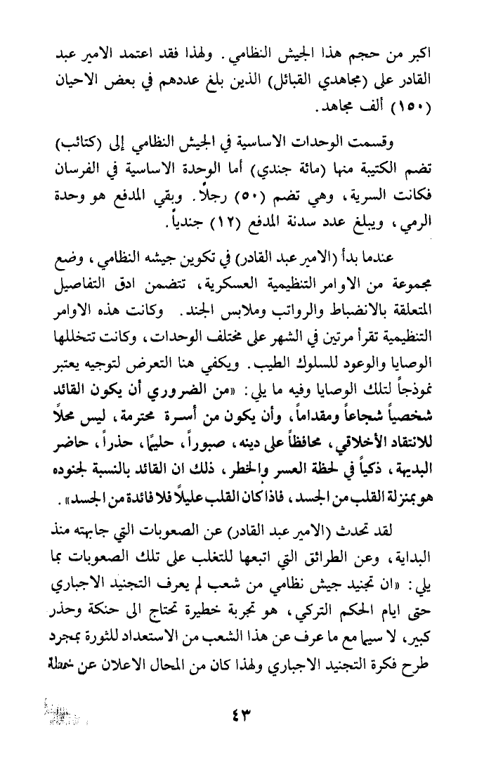 عندما بدأ (الأمير عبد القادر) في تكوين جيشه النظامي، وضع مجموعة من الأوامر التنظيمية العسكرية، تتضمن أدق التفاصيل المتعلقة بالانضباط والرواتب وملابس الجند. وكانت هذه الأوامر التنظيمية تقرأ مرتين في الشهر على مختلف الوحدات، وكانت تتخللها الوصايا والوعود للسلوك الطيب. ويكفي هنا التعرض لتوجيه يعتبر نموذجا لتلك الوصايا وفيه ما يلي: (من الضروري أن يكون القائد شخصيا شجاعا ومقداما، وأن يكون من أسرة محترمة، ليس محلا للانتقاد الأخلاقي، محافظا على دينه، صبورا، حليما، حذرا، حاضر البديهة، ذكيا في لحظة العسر والخطر، ذلك أن القائد بالنسبة لجنوده هو بمنزلة القلب من الجسد، فإذا كان القلب عليلا فلا فائدة من الجسد).