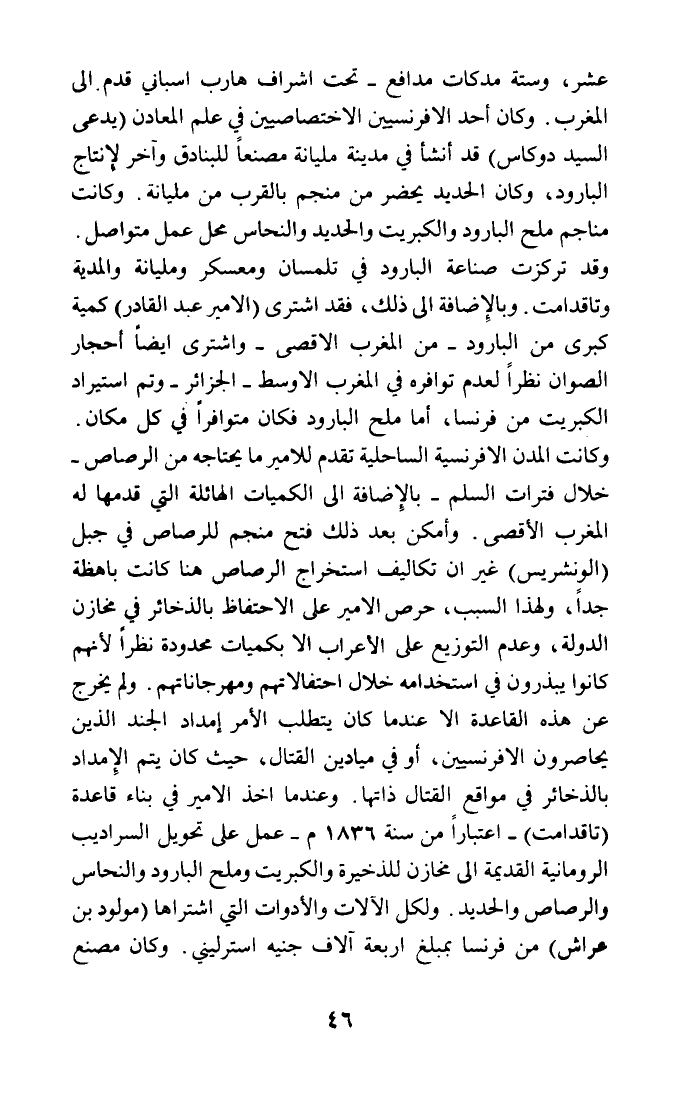 عشر، وستة مدكات مدافع - تحت إشراف هارب إسباني قدم إلى المغرب. وكان أحد الإفرنفسيين الإختصاصيين في علم المعادن (يدعى السيد دوكاس) قد أنشأ في مدينة مليانة مصنعا للبنادق وآخر لإنتاج البارود، وكان الحديد يحضر من منجم بالقرب من مليانة. وكانت مناجم ملح البارود والكبريت والحديد والنحاس محل عمل متواصل. وقد تركزت صناعة البارود في تلمسان ومعسكر ومليانة والمدية وتاقدات. وبالإضافة إلى ذلك، فقد اشترى (الأمير عبد القادر) كمية كبرى من البارود - من المغرب الأقصى - واشترى أيضا أحجار الصوان نظرا لعدم توافره في المغرب الأوسط - الجزائر - وتم استيراد الكبريت من فرنسا، أما ملح البارود فكان متوافرا في كل مكان. وكانت المدن الإفرنسية الساحلية تقدم للأمير ما يحتاجه من الرصاص - خلال فترات السلم - بالإضافة إلى الكميات الهائلة التي قدمها له المغرب الأقصى. وأمكن بعد ذلك فتح منجم للرصاص في جبل (الونشريس) غير أن تكاليف استخراج الرصاص هنا كانت باهظة جدا، ولهذا السبب، حرص الأمير على الاحتفاظ بالذخائر في مخازن الدولة، وعدم التوزيع على الأعراب إلا بكميات محدودة نظرا لأنهم كانوا يبذرون في اسخدامه خلال احتفالاتهم ومهرجاناتهم. ولم يخرج عن هذه القاعدة إلا عندما كان يتطلب الأمر إمداد الجند الذين يحاصرون الإفرنسيين، أو في ميادين القتال، حيث كان يتم الإمداد بالذخائر في مواقع القتال ذاتها. وعندما أخذ الأمير في بناء قاعدة (تاقدامت) - اعتبارا من سنة 1836 م - عمل على تحويل السراديب الرومانية القديمة إلى مخازن للذخيرة والكبريت وملح البارود والنحاس والرصاص والحديد. ولكل الآلات والأدوات التي اشتراها (مولود بن عراش) من فرنسا بمبلغ أربعة آلاف جنيه استرليني. وكان مصنع