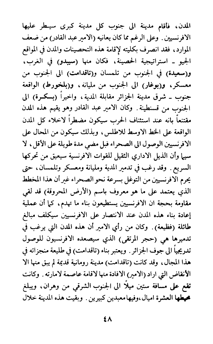المدن، فأقام مدينة إلى جنوب كل مدينة كبرى سيطر عليها الإفرنسيين. وعلى الرغم مما كان يعانيه (الأمير عبد القادر) من ضعف الموارد، فقد انصرف بكليته لإقامة هذه التحصينات والمدن في المواقع الجيو - استراتيجية الحصينة، فكان منها (سيبدو) في الغرب، و (سعيدة) في الجنوب من تلمسان و (تاقدامت) إلى الجنوب من معسكر، و (بوغار) إلى الجنوب من مليانة، و (بلخورط) الواقعة جنوب - شرق مدينة الجزائر مقابلة المدية، وأخيرا (بسكرة) إلى الجنوب من قسنطينة. وكان الأمير عبد القادر وهو يقيم هذه المدن مقتنعا بأنه عند استئناف الحرب سيكون مضطرا لإخلاء كل المدن الواقعة على الخط الأوسط للأطلس، وبذلك سيكون من المحال على الإفرنسيين الوصول إلى الصحراء قبل مضي مدة طويلة على الأقل، لا سيما وأن الذيل الإداري الثقيل للقوات الإفرنسية سيعيق من تحركها السريع. وقد رغب في تدمير المدية ومليانة ومعسكر وتلمسان، حتى يحرم الإفرنسيين من التوغل بسرعة نحو الصحراء غير أن هذا المخطط الذي يعتمد على ما هو معروف باسم (الأرض المحروقة) قد لقي مقاومة بحجة أن الإفرنسيين يستطيعون بناء ما تهدم، كما أن عملية إعادة بناء هذه المدن عند الانتصار على الإفرنسيين سيكلف مبالغ طائلة (فظيعة). وكان من رأي الأمير أن هذه المدن التي يرغب في تدميرها هي (حجر المرتقى) التي سيصعده الإفرنسيون للوصول تدرمجيا إلى جوف الجزائر. ويعتبر بناء (تاقدامت) في طليعة منجزاته في هذا المجال، وقد كانت (تاقدامت) مدينة رومانية قديمة لم يبق منها إلا الأنقاض التي أراد (الأمير) الإفادة منها لإقامة عاصمة لإمارته. وكانت تقع على مسافة ستين ميلا إلى الجنوب الشرقي من وهران، ويبلغ محيطها العشرة أميال، وفيها معبدين كبيرين. وبقيت هذه المدينة خلال