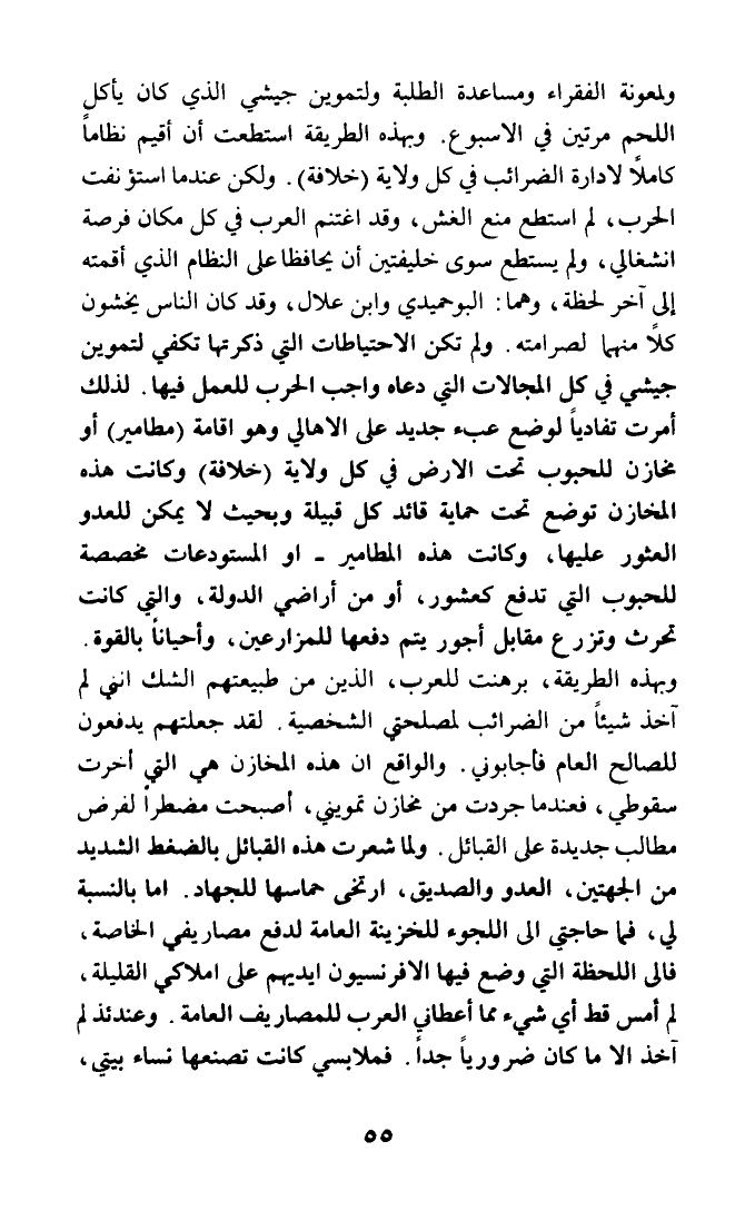 ولمعونة الفقراء ومساعدة الطلبة ولتموين جيشي الذي كان يأكل اللحم مرتين في الأسبوع. وبهذه الطريقة استطعت أن أقيم نظاما كاملا لإدارة الضرائب في كل ولاية (خلافة). ولكن عندما استؤنفت الحرب، لم أستطع منع الغش، وقد اغتنم العرب في كل مكان فرصة انشغالي، ولم يستطع سوى خليفتين أن يحافظا على النظام الذي أقمته إلى آخر لحظة، وهما: البوحميدي وابن علال، وقد كان الناس يخشون كلا منهما لصرامته. ولم تكن الاحتياطات التي ذكرتها تكفي لتموين جيشي في كل المجالات التي دعاه واجب الحرب للعمل فيها. لذلك أمرت تفاديا لوضع عبء جديد على الأهالي وهو إقامة (مطامير) أو مخازن للحبوب تحت الأرض في كل ولاية (خلافة) وكانت هذه المخازن توضع تحت حماية قائد كل قبيلة وبحيث لا يمكن للعدو العثور عليها، وكانت هذه المطامير - أو المستودعات مخصصة للحبوب التي تدفع كعشور، أو من أراضي الدولة، والتي كانت تحرث وتزرع مقابل أجور يتم دفعها للمزارعين، وأحيانا بالقوة. وبهذه الطريقة، برهنت للعرب، الذين من طبيعتهم الشك أنني لم آخذ شيئا من الضرائب لمصلحتي الشخصية. لقد جعلتهم يدفعون للصالح العام فأجابوني. والواقع أن هذه المخازن هي التي أخرت سقوطي، فعندما جردت من مخازن تمويني، أصبحت مضطرا لفرض مطالب جديدة على القبائل. ولما شعرت هذه القبائل بالضغط الشديد من الجهتين، العدو والصديق، ارتخى حماسها للجهاد. أما بالنسبة لي، فما حاجتي إلى اللجوء للخزينة العامة لدفع مصاريفي الخاصة، فإلى اللحظة التي وضع فيها الإفرنسيون أيديهم على أملاكي القليلة، لم أمس قط أي شيء مما أعطاني العرب للمصاريف العامة. وعندئذ لم آخذ إلا ما كان ضروريا جدا. فملابسمي كانت تصنعها نساء بيتي،