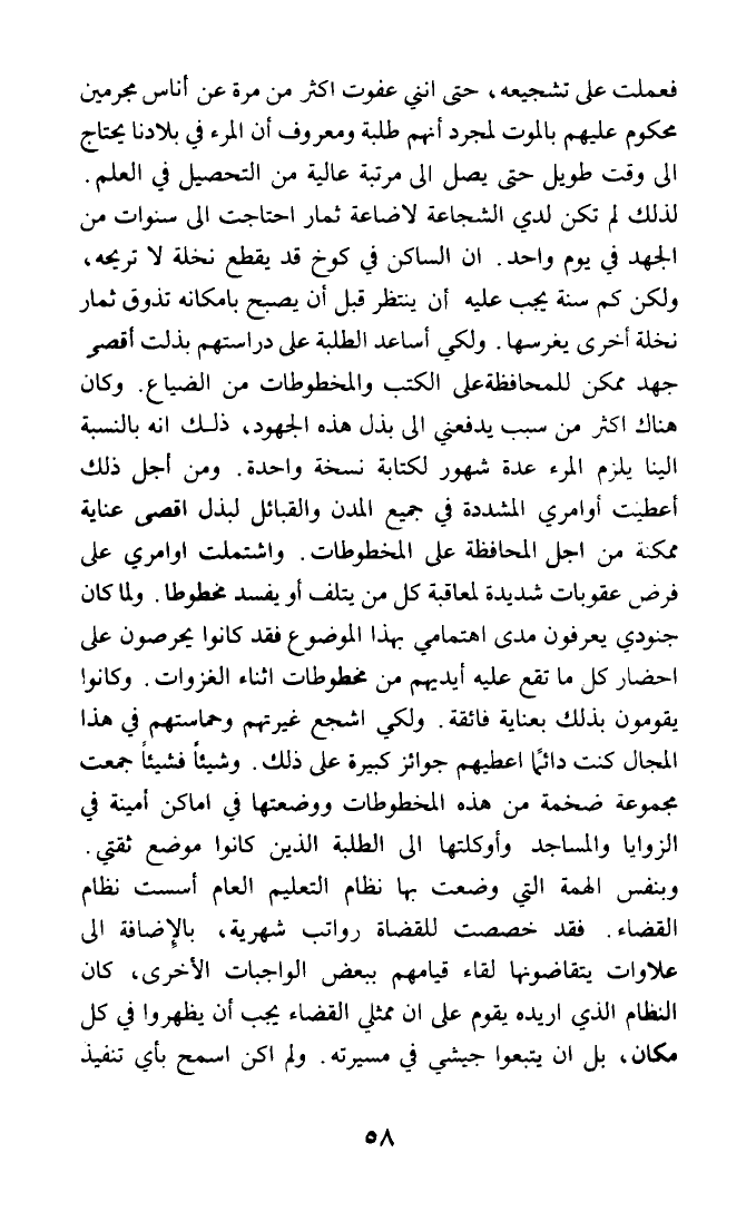 فعملت على تشجيعه، حتى إنني عفوت أكثر من مرة عن أناس مجرمين محكوم عليهم بالموت لمجرد أنهم طلبة ومعروف أن المرء في بلادنا يحتاج إلى وقت طويل حتى يصل إلى مرتبة عالية من التحصيل في العلم. لذلك لم تكن لدي الشجاعة لإضاعة ثمار احتاجت إلى سنوات من الجهد في يوم واحد. إن الساكن في كوخ قد يقطع نخلة لا تريحه، ولكن كم سنة يجب عليه أن ينتظر قبل أن يصبح بإمكانه تذوق ثمار نخلة أخرى يغرسها. ولكي أساعد الطلبة على دراستهم بذلت أقصر جهد ممكن للمحافظة على الكتب والمخطوطات من الضياع. وكان هناك أكثر من سبب يدفعني إلى بذل هذه الجهود، ذلك أنه بالنسبة إلينا يلزم المرء عدة شهور لكتابة نسخة واحدة. ومن أجل ذلك أعطيت أوامري المشددة في جميع المدن والقبائل لبذل أقصى عناية ممكمة من أجل المحافظة على المخطوطات. واشتملت أوامري على فرض عقوبات شديدة لمعاقبة كل من يتلف أو يفسد مخطوطا. ولما كان جنودي يعرفون مدى اهتمامي بهذا الموضوع فقد كانوا يحرصون على إحضار كل ما تقع عليه أيديهم من مخطوطات أثناء الغزوات. وكانوا يقومون بذلك بعناية فائقة. ولكي أشجع غيرتهم وحماستهم في هذا المجال كنت دائما أعطيهم جوائز كبيرة على ذلك. وشيئا فشيئا جمعت مجموعة ضخمة من هذه المخطوطات ووضعتها في أماكن أمينة في الزوايا والمساجد وأوكلتها إلى الطلبة الذين كانوا موضع ثقني. وبنفس الهمة التي وضعت بها نظام التعليم العام أسست نظام القضاء. فقد خصصت للقضاة رواتب شهرية، بالإضافة إلى علاوات يتقاضونها لقاء قيامهم ببعض الواجبات الأخرى، كان النطام الذي أريده يقوم على أن ممثلي القضاء يجب أن يظهروا في كل مكان، بل أن يتبعوا جيشي في مسيرته. ولم أكن أسمح بأي تنفيد