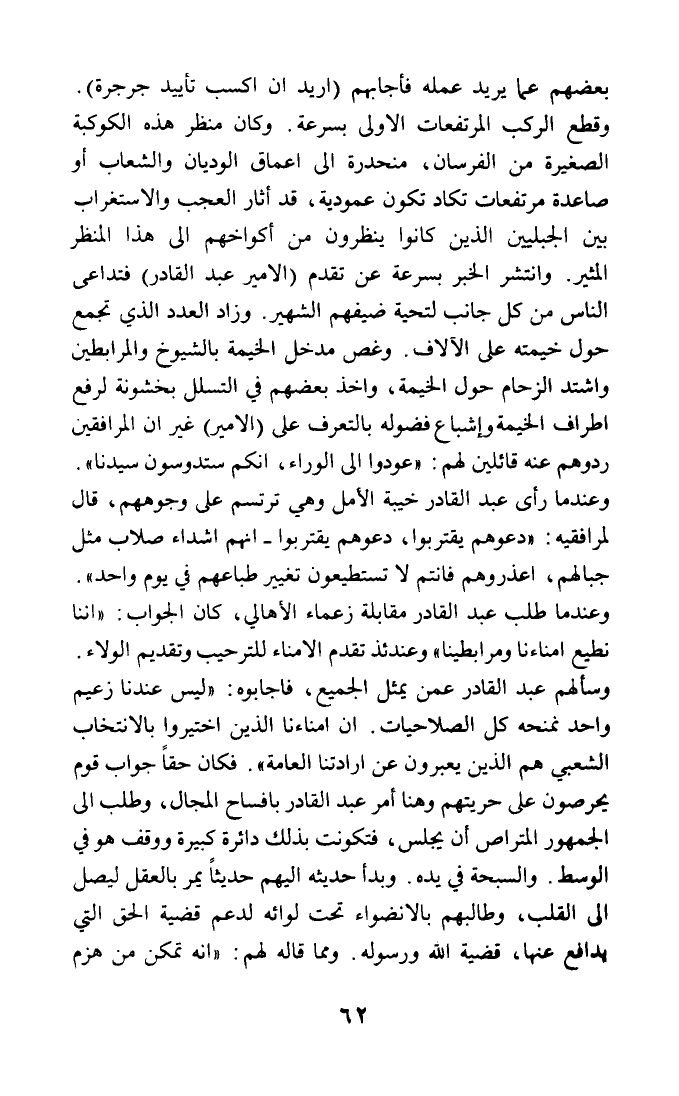 بعضهم عما يريد عمله فأجابهم (أريد أن أكسب تأييد جرجرة). وقطع الركب المرتفعات الأولى بسرعة. وكان منظر هذه الكوكبة الصغيرة من الفرسان، منحدرة إلى أعماق الوديان والشعاب أو صاعدة مرتفعات تكاد تكون عمودية، قد أثار العجب والاستغراب بين الجبليين الذين كانوا ينظرون من أكواخهم إلى هذا المنظر المثير. وانتشر الخبر بسرعة عن تقدم (الأمير عبد القادر) فتداعى الناس من كل جانب لتحية ضيفهم الشهير. وزاد العدد الذي تجمع حول خيمته على الآلاف. وغص مدخل الخيمة بالشيوخ والمرابطين واشتد الزحام حول الخيمة، وأخذ بعضهم في التسلل بخشونة لرفع أطراف الخيمة وإشباع فضوله بالتعرف على (الأمير) غير أن المرافقين ردوهم عنه قائلين لهم: (عودوا إلى الوراء، إنكم ستدوسون سيدنا). وعندما رأى عبد القادر خيبة الأمل وهي ترتسم على وجوههم، قال لمرافقيه: (دعوهم يقتربوا، دعوهم يقتربوا - إنهم أشداء صلاب مثل جبالهم، اعذروهم فأنتم لا تستطيعون تغيير طباعهم في يوم واحد). وعندما طلب عبد القادر مقابلة زعماء الأهالي، كان الجواب: (إننا نطيع أمناءنا ومرابطينا) وعندئذ تقدم الأمناء للترحيب وتقديم الولاء. وسألهم عبد القادر عمن يمثل الجميع، فأجابوه: (ليس عندنا زعيم واحد نمنحه كل الصلاحيات. إن أمناءنا الذين اختيروا بالانتخاب الشعبي هم الذين يعبرون عن إرادتنا العامة). فكان حقا جواب قوم يحرصون على حريتهم وهنا أمر عبد القادر بإفساح المجال، وطلب إلى الجمهور المتراص أن يجلس، فتكونت بذلك دائرة كبيرة ووقف هو في الوسط. والسبحة في يده. وبدأ حديثه إليهم حديثا يمر بالعقل ليصل إلى القلب، وطالبهم الإنضواء تحت لوائه لدعم قضية الحق التي يدافع عنها، قضية الله ورسوله. ومما قاله لهم: (أنه تمكن من هزم